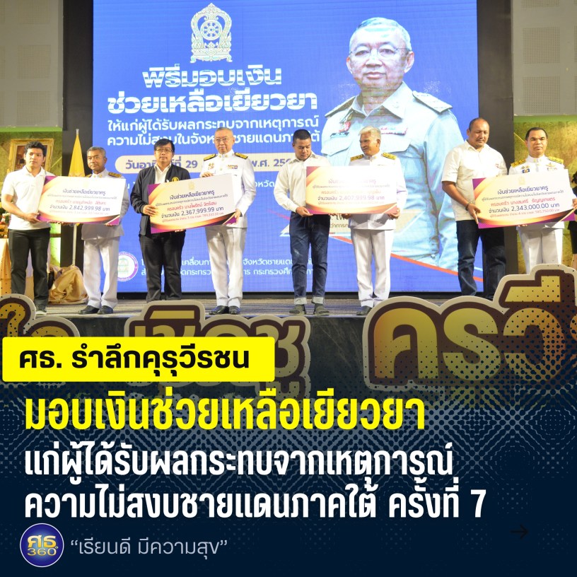 โดยสมาพันธ์ครูจังหวัดชายแดนภาคใต้ และศูนย์ขับเคลื่อนการศึกษาในจังหวัดชายแดนภาคใต้ ร่วมกันจัดงานรำลึกคุรุวีรชนชายแดนใต้ ครั้งที่ 14 และพิธีมอบเงินช่วยเหลือเยียวยาให้แก่ผู้ได้รับผลกระทบจากเหตุการณ์ความไม่สงบในจังหวัดชายแดนภาคใต้ ครั้งที่ 7 ให้แก่ครอบครัวผู้ได้รับความเสียหาย จำนวน 24 ราย ซึ่งมีผู้ได้รับผลกระทบ จำนวน 94 ราย เป็นเงินกว่า 61 ล้านบาทเศษ รวมมอบเงินช่วยเหลือเยียวยาแล้วทั้งสิ้น จำนวน 164 ราย มีผู้ได้รับผลกระทบ จำนวน 593 ราย รวมเป็นเงินกว่า 434 ล้านบาทเศษ