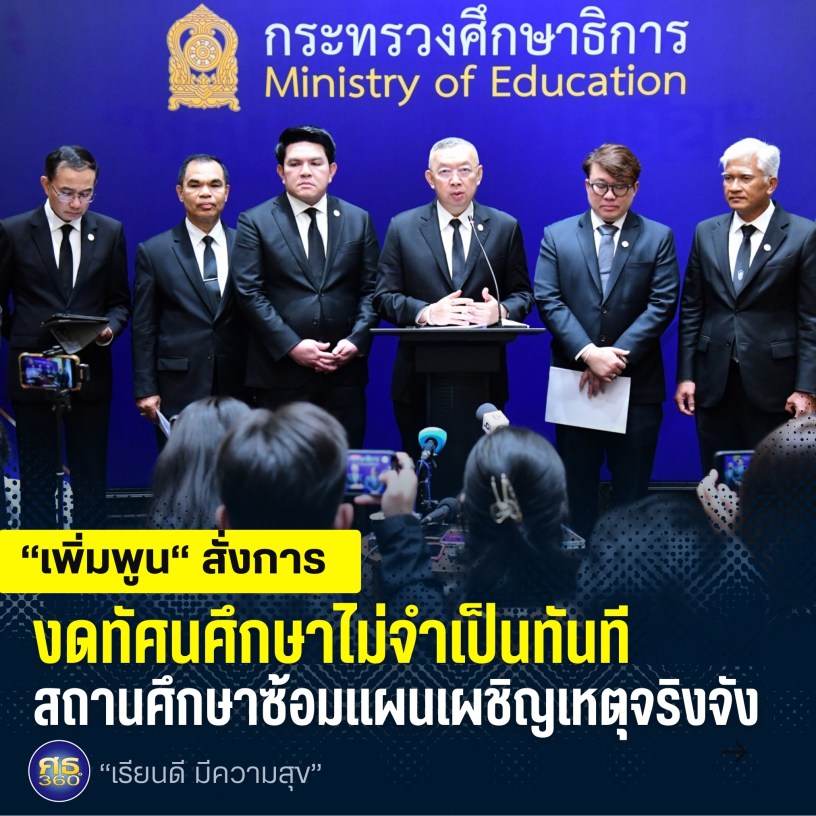 ภายหลังการประชุม รมว.ศธ. พร้อมด้วยนายสุรศักดิ์ พันธ์เจริญวรกุล รมช.ศธ. นายสิริพงศ์ อังคสกุลเกียรติ คณะที่ปรึกษา รมว.ศธ. นายสุเทพ แก่งสันเทียะ ปลัด ศธ. ว่าที่ร้อยตรี ธนุ วงษ์จินดา เลขาธิการ กพฐ. นายยศพล เวณุโกเศศ เลขาธิการ กอศ. นายประวิต เอราวรรณ์ เลขาธิการ สกศ. และนางอมลวรรณ วีระธรรมโม เลขาธิการ คส. แถลงข่าว ณ ห้องแถลงข่าว สรุปสาระสำคัญ ดังนี้