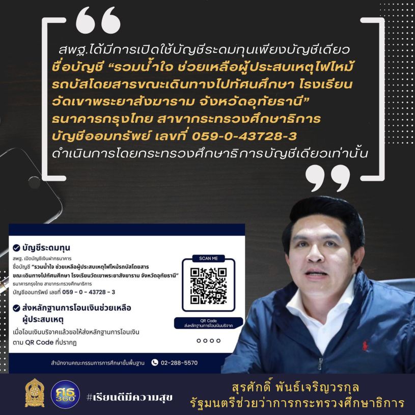 “ล่าสุดผมได้รับข้อมูลว่าทาง สพฐ.ได้มีการเปิดใช้บัญชีระดมทุนเพียงบัญชีเดียว คือ ชื่อบัญชี “รวมน้ำใจ ช่วยเหลือผู้ประสบเหตุไฟไหม้รถบัสโดยสารขณะเดินทางไปทัศนศึกษา โรงเรียนวัดเขาพระยาสังฆาราม จังหวัดอุทัยธานี” ธนาคารกรุงไทย สาขากระทรวงศึกษาธิการ บัญชีออมทรัพย์ เลขที่ 059-0-43728-3 ซึ่งดำเนินการโดยกระทรวงศึกษาธิการ เพียงบัญชีเดียวเท่านั้น” นายสุรศักดิ์ กล่าว