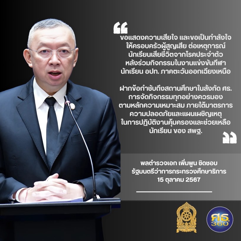 15 ตุลาคม 2567 – พล.ต.อ.เพิ่มพูน ชิดชอบ รัฐมนตรีว่าการกระทรวงศึกษาธิการ แสดงความเสียใจต่อเหตุการณ์นักเรียนชั้นมัธยมศึกษาปีที่ 6 จังหวัดอุดรธานี เสียชีวิตจากโรคประจำตัวหลังร่วมกิจกรรมในงานแข่งขันกีฬานักเรียนองค์กรปกครองส่วนท้องถิ่นแห่งประเทศไทย ภาคตะวันออกเฉียงเหนือ