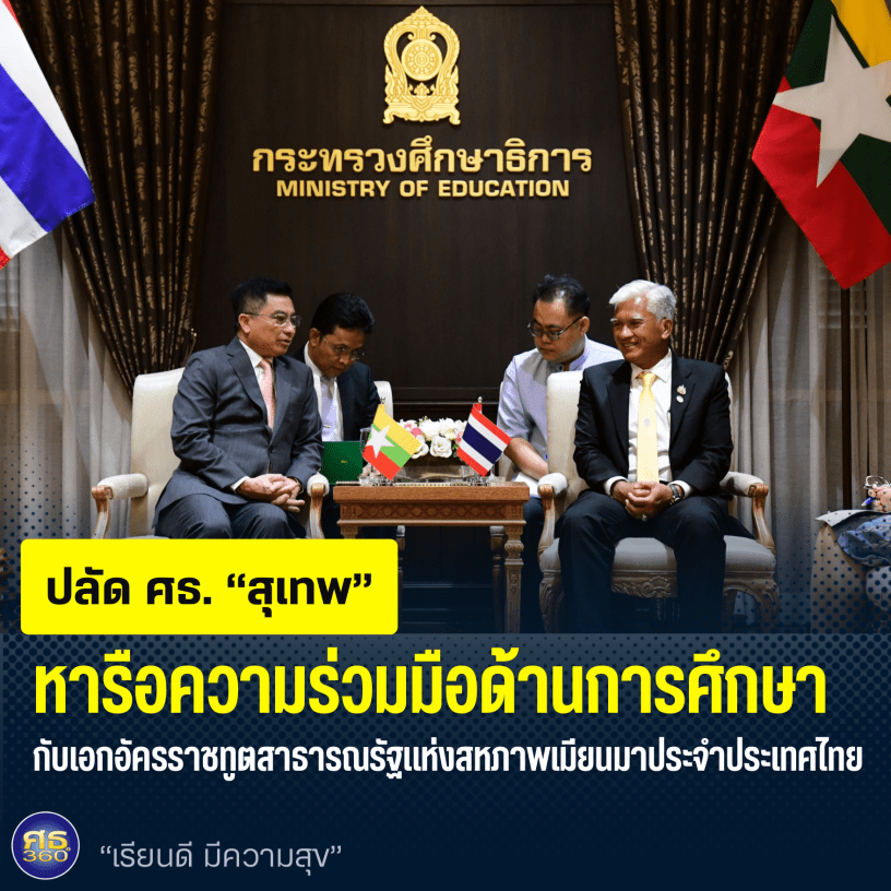 เมื่อวันศุกร์ที่ 25 ตุลาคม 2567 นายสุเทพ แก่งสันเทียะ ปลัดกระทรวงศึกษาธิการ ให้การต้อนรับ นายอูชิตสเว่ (H.E. U Chit Swe) เอกอัครราชทูตสาธารณรัฐแห่งสหภาพเมียนมาประจำประเทศไทยและคณะ ในโอกาสเข้าเยี่ยมคารวะและหารือความร่วมด้านการศึกษา โดยมี นางสาวจิตรลดา จันทร์แหยม รักษาราชการแทนผู้อำนวยการสำนักความสัมพันธ์ต่างประเทศ และผู้เกี่ยวข้องเข้าร่วมหารือ ณ ห้องดำรงราชานุภาพ อาคารราชวัลลภ กระทรวงศึกษาธิการ