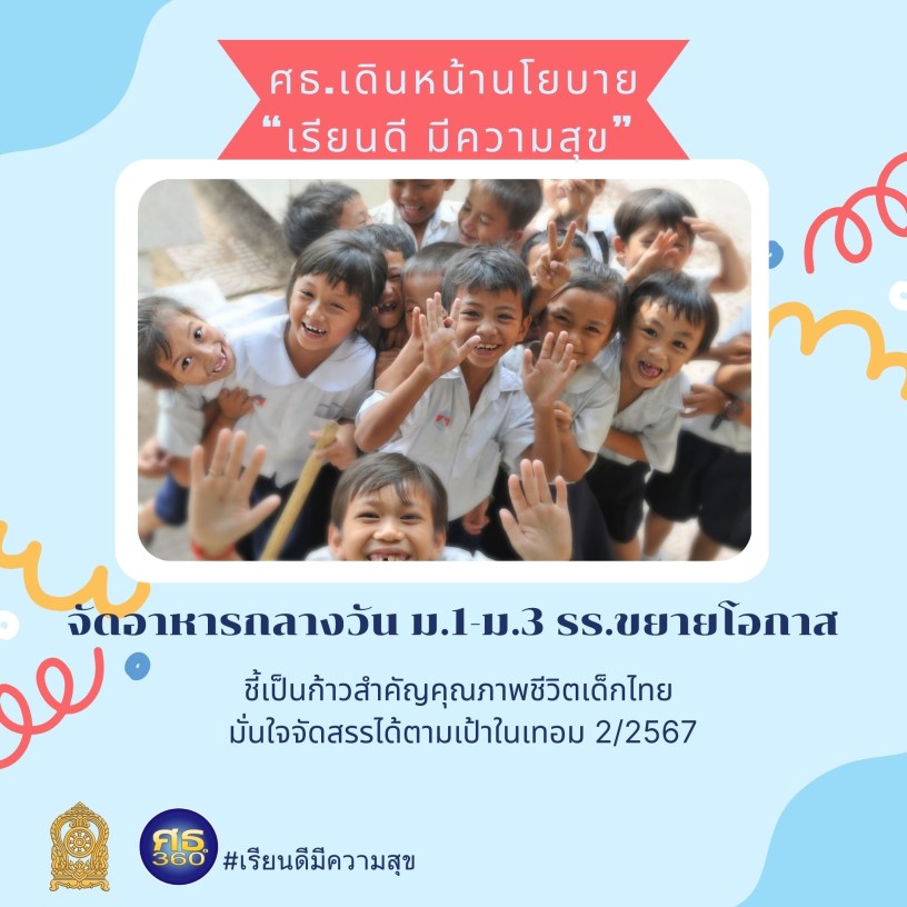 1 พฤศจิกายน 2567 – พล.ต.อ.เพิ่มพูน ชิดชอบ รัฐมนตรีว่าการกระทรวงศึกษาธิการ (รมว.ศธ.) กล่าวถึงมติคณะรัฐมนตรี เมื่อวันที่ 26 มีนาคม 2567 อนุมัติงบอาหารกลางวัน 2,955 ล้านบาท ในกลุ่มโรงเรียนขยายโอกาสทุกสังกัด 7,344 แห่ง รวม 575,983 คน ได้รับสูงสุด 36 บาท/คน/วัน ถือเป็นการตัดสินใจที่สำคัญต่อการพัฒนาคุณภาพชีวิตของเด็ก ๆ และผู้ปกครองทั่วประเทศที่มุ่งหวังให้บุตรหลานได้รับโภชนาการที่ดีและเพียงพอ ซึ่งรัฐมนตรีว่าการกระทรวงศึกษาธิการ และนายสุรศักดิ์ พันธ์เจริญวรกุล รัฐมนตรีช่วยว่าการกระทรวงศึกษาธิการ (รมช.ศธ.) ขอแสดงความขอบคุณต่อ ครม. สำหรับการอนุมัติโครงการดังกล่าว พร้อมชี้ว่าโครงการนี้จะช่วยให้เด็ก ๆ ม.1-ม.3 ในโรงเรียนขยายโอกาสได้มีอาหารกลางวันรับประทานอย่างครบถ้วน เช่นเดียวกับนักเรียนระดับประถมศึกษา
