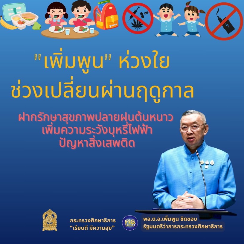 5 พฤศจิกายน 2567 – พลตำรวจเอก เพิ่มพูน ชิดชอบ รัฐมนตรีว่าการกระทรวงศึกษาธิการ มีข้อห่วงใยถึงภัยที่มาในช่วงเปลี่ยนผ่านฤดูกาล ย้ำผู้เรียนดูและรักษาสุขภาพร่างกายให้แข็งแรง รวมถึงความปลอดภัยในสถานศึกษาด้วย