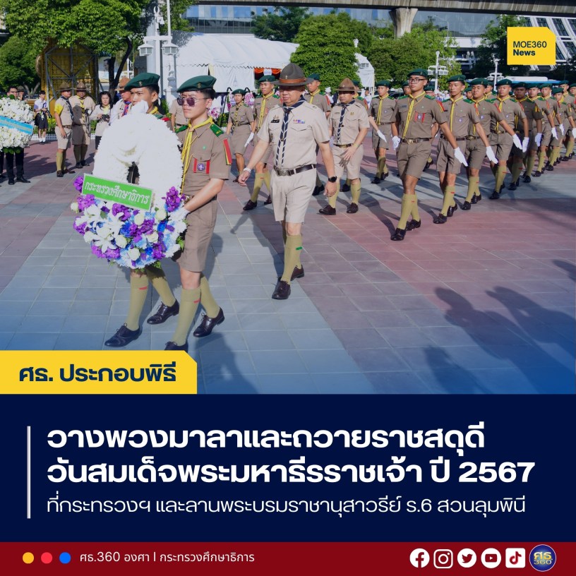 08.15 น. : 25 พฤศจิกายน 2567 / พลตำรวจเอก เพิ่มพูน ชิดชอบ รัฐมนตรีว่าการกระทรวงศึกษาธิการ ในฐานะประธานคณะกรรมการบริหารลูกเสือแห่งชาติ เป็นประธานพิธีวางพวงมาลาถวายราชสดุดี และถวายบังคมพระราชานุสาวรีย์ พระบาทสมเด็จพระมงกุฎเกล้าเจ้าอยู่หัว เนื่องในวันสมเด็จพระมหาธีรราชเจ้า หรือวันคล้ายวันสวรรคตของพระบาทสมเด็จพระมงกุฎเกล้าเจ้าอยู่หัว ประจำปี 2567 ณ ลานพระบรมราชานุสาวรีย์ รัชกาลที่ 6 สวนลุมพินี