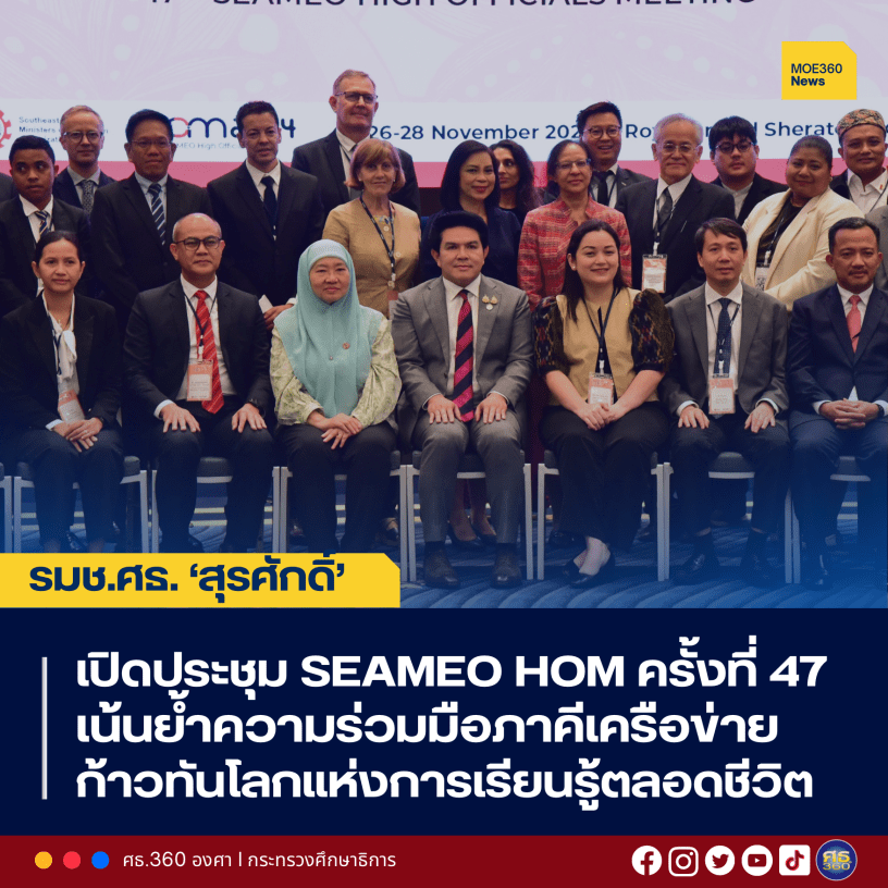 27 พฤศจิกายน 2567 – นายสุรศักดิ์ พันธ์เจริญวรกุล รัฐมนตรีช่วยว่าการกระทรวงศึกษาธิการ เป็นประธานในพิธีเปิดการประชุมเจ้าหน้าที่อาวุโสของซีมีโอ ครั้งที่ 47 (47th SEAMEO High Officials Meeting: SEAMEO HOM) โดยนายพิเชฐ โพธิ์ภักดี รองปลัดกระทรวงศึกษาธิการ นางสาวจิตรลดา จันทร์แหยม รักษาราชการแทนผู้อำนวยการสำนักความสัมพันธ์ต่างประเทศ สป. เจ้าหน้าที่อาวุโสระดับสูงจากประเทศสมาชิกซีมีโอ 11 ประเทศ ผู้แทนประเทศสมาชิก ผู้แทนศูนย์และเครือข่ายระดับภูมิภาคของซีมีโอ และหุ้นส่วนความร่วมมือจากนานาชาติ กว่า 150 คน ณโรงแรม รอยัล ออคิด เชอราตัน โฮเทล แอนด์ ทาวเวอร์ส กรุงเทพฯ