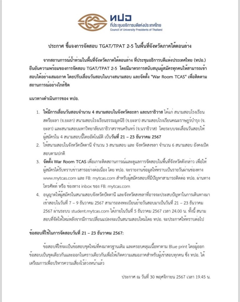 โฆษก ศธ. เปิดเผยว่า จากเหตุอุทกภัยที่ในพื้นที่ภาคใต้ตอนล่างกำลังเผชิญอยู่ แน่นอนว่าเกิดผลกระทบกับพี่ ม.6 ที่กำลังเตรียมตัวเพื่อเข้าสอบ TGAT/TPAT ที่กำลังจะเกิดขึ้นในวันที่ 7- 9 ธันวาคมนี้ ศธ.ได้ประสานกับ ทปอ. (ที่ประชุมอธิการบดีแห่งประเทศไทย) ทราบข้อมูลว่ามีประกาศชี้แจงปรับเลื่อนวันสอบ 4 สนาม ในพื้นที่ประสบภัยน้ำท่วม จ.ยะลา และ จ.นราธิวาส เป็นวันที่ 21 – 23 ธันวาคม 2567 จึงทำให้เกิดความกังวลกับตัวผู้สอบบางส่วนเรื่องความไม่เสมอภาคในการจัดสอบ เพราะมีข้อสอบชุดที่ 2 เพิ่มขึ้นมา