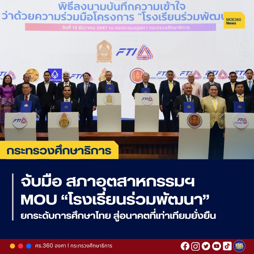 กระทรวงศึกษาธิการ – 13 ธันวาคม 2567 / พลตำรวจเอก เพิ่มพูน ชิดชอบ รัฐมนตรีว่าการกระทรวงศึกษาธิการ เป็นประธานพิธีลงนามบันทึกความเข้าใจว่าด้วยความร่วมมือโครงการ “โรงเรียนร่วมพัฒนา” (Partnership School Project) พร้อมด้วยนายเกรียงไกร เธียรนุกุล ประธานสภาอุตสาหกรรมแห่งประเทศไทย (ส.อ.ท.) โดยมีนายสิริพงศ์ อังคสกุลเกียรติ ผู้ช่วยรัฐมนตรีประจำ ศธ. นายสุเทพ แก่งสันเทียะ ปลัด ศธ. ว่าที่ ร.ต.ธนุ วงษ์จินดา เลขาธิการ กพฐ. นายยศพล เวณุโกเศศ เลขาธิการ กอศ. ผู้บริหาร ศธ. ตลอดจนผู้บริหารจากภาครัฐ-เอกชน-ประชาสังคม เข้าร่วม ณ ห้องประชุมบุณยเกตุ หอประชุมคุรุสภา