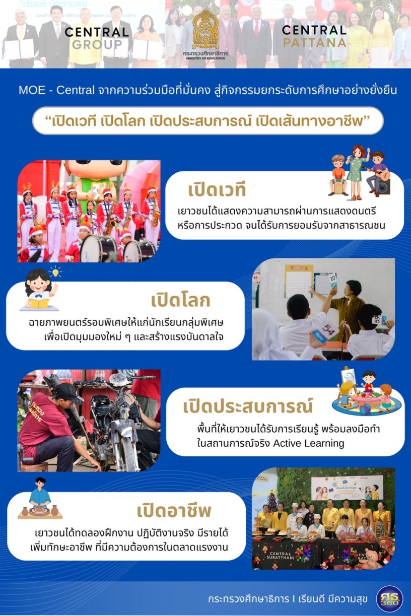 ประเทศไทยกำลังพลิกโฉมความร่วมมือทางการศึกษาให้ก้าวล้ำไปอีกขั้น จากความร่วมมือที่มั่นคงสู่กิจกรรมยกระดับการศึกษาอย่างยั่งยืน ผ่านความร่วมมือสำคัญระหว่าง กระทรวงศึกษาธิการ และกลุ่มบริษัทเซ็นทรัล รวมถึงบริษัทเซ็นทรัลพัฒนา จำกัด (มหาชน) ในการเปิดตัวโครงการ “เรียนดี มีความสุข สู่อนาคตที่สดใส” ซึ่งจะมุ่งเน้นการสร้างสมดุลระหว่างคุณภาพการศึกษาและความสุขของผู้เรียน เพื่อเตรียมเยาวชนไทยให้พร้อมสำหรับโลกในอนาคต โดยสร้างสรรค์พื้นที่แห่งแรงบันดาลใจ ณ ห้างสรรพสินค้าเครือเซ็นทรัลทั่วประเทศ นับเป็นการส่งต่อความสุขและสร้างโอกาสทางการศึกษาให้แก่เยาวชนในทุกภูมิภาคของไทย