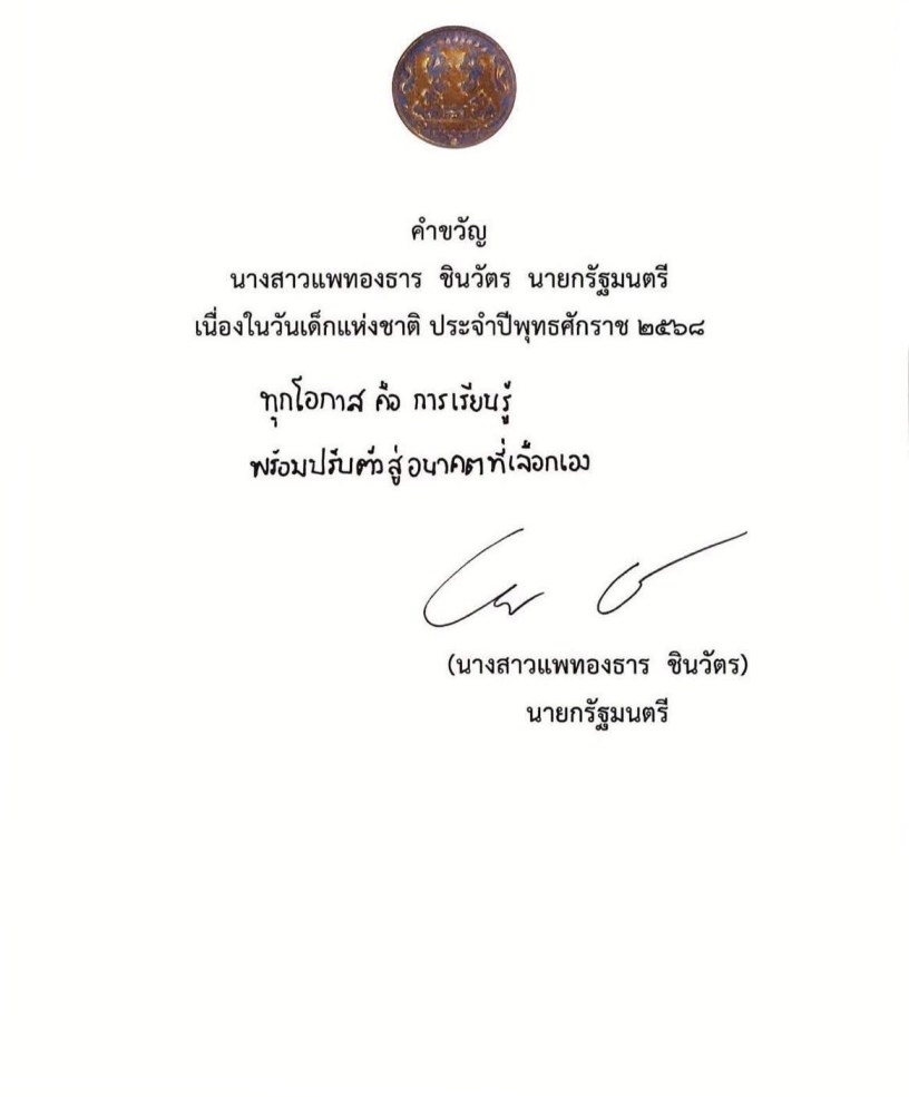 นางสาวแพทองธาร ชินวัตร นายกรัฐมนตรี มอบคำขวัญ เนื่องในโอกาส “วันเด็กแห่งชาติ” ประจำปีพุทธศักราช 2568 วันเสาร์ที่ 11 มกราคม 2568