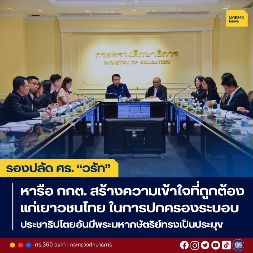 8 มกราคม 2568 / นายวรัท พฤกษาทวีกุล รองปลัดกระทรวงศึกษาธิการ พร้อมด้วย นายวีระ ยี่แพร รองเลขาธิการคณะกรรมการการเลือกตั้ง ร่วมหารือแนวทางบูรณาการการขับเคลื่อนยุทธศาสตร์เพื่อสร้างความรู้ความเข้าใจที่ถูกต้องเกี่ยวกับการปกครองระบอบประชาธิปไตยอันมีพระมหากษัตริย์ทรงเป็นประมุข ณ ห้องประชุมจันทรเกษม อาคารราชวัลลภ