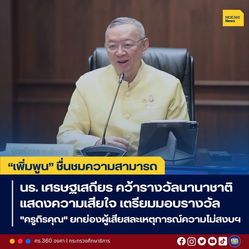 รมว.ศธ. “เพิ่มพูน” เป็นประธานการประชุมประสานภารกิจ ครั้งที่ 2/2568 เผย ศธ. เร่งยกระดับคุณภาพการศึกษา PISA หาแนวทางผลักดันให้มีผู้สมัครใจสอบ O-NET ต่อเนื่อง ชื่นชมนักเรียนโรงเรียนเศรษฐเสถียรฯ ได้รับรางวัลระดับชาติ-นานาชาติที่เกาหลี พร้อมแสดงความเสียใจต่อครอบครัว ครู ตชด. ที่เสียสละจากเหตุการณ์ความไม่สงบที่นราธิวาส รวมทั้งยินดีในความสำเร็จสำคัญของ ศธ. ที่สามารถสร้างพื้นที่แห่งความสุขให้กับเยาวชนทั่วประเทศ งานวันเด็กแห่งชาติ 2568
