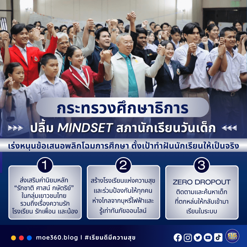 “ภูมิใจที่ได้เห็น Mindset นักเรียนไทยในเชิงบวกมากขึ้น ศธ.พร้อมรับฟังทุกเสียงของผู้เรียนเพื่อนำมาปรับปรุงและพัฒนาระบบการเรียนรู้ที่ตอบโจทย์นโยบาย “เรียนดี มีความสุข” ทุกข้อเสนอที่ได้รับจะเร่งดำเนินการเพื่อปฏิรูปการศึกษา สร้างการเปลี่ยนแปลงอย่างเป็นรูปธรรมให้เป็นจริงได้ไม่เกินฝัน จากการมีส่วนร่วมของทุกภาคส่วน ทั้งนักเรียน ผู้ปกครอง ครูและบุคลากรทางการศึกษา ขอยืนยันว่าเราจะเดินหน้าพลิกโฉมการศึกษาไทยต่อไปในปีนี้ ให้ทุกเสียงของนักเรียนที่สะท้อนมาได้รับการพิจารณาอย่างจริงจังในทุกมิติ” โฆษก ศธ. กล่าว