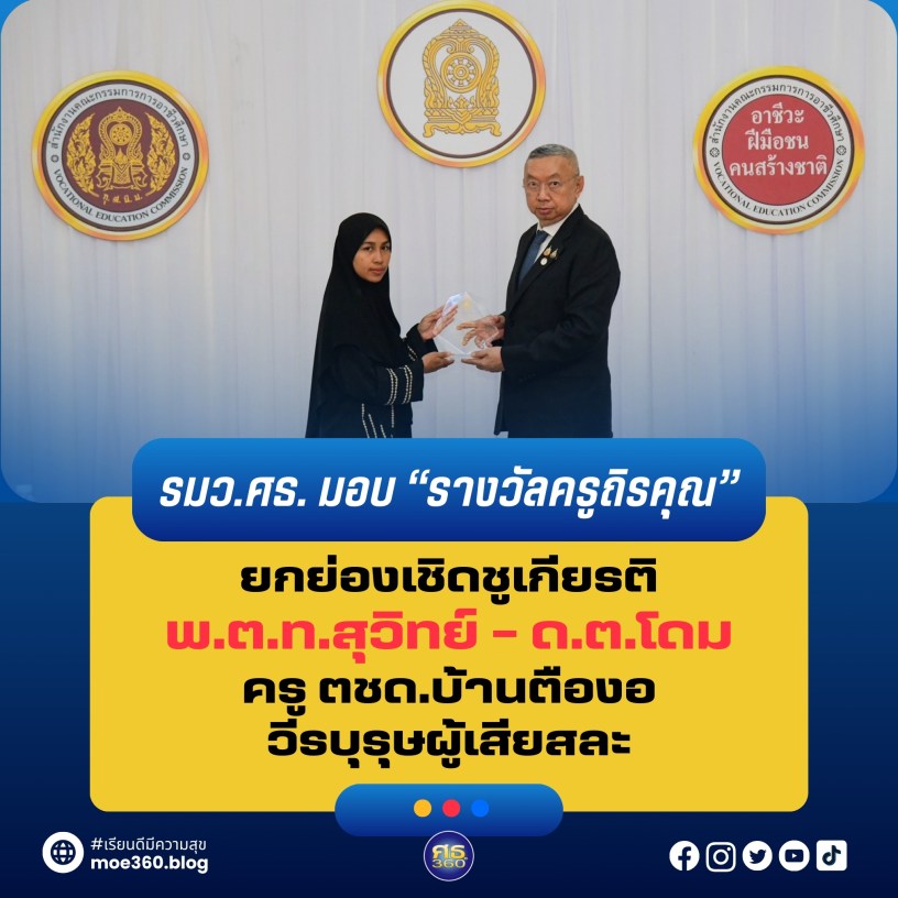 จังหวัดพัทลุง 24 มกราคม 2568 / พลตำรวจเอก เพิ่มพูน ชิดชอบ รัฐมนตรีว่าการกระทรวงศึกษาธิการ มอบ “รางวัลครูถิรคุณ” ให้แก่ พ.ต.ท.สุวิทย์ ช่วยเทวฤทธิ์ และ ด.ต.โดม ช่วยเทวฤทธิ์ เพื่อประกาศยกย่องเชิดชูเกียรติบุคคลที่ปฏิบัติหน้าที่ด้วยความมุ่งมั่น ตั้งใจ เสียสละ ยึดมั่นอุดมการณ์ในวิชาชีพครู ณ วิทยาลัยเทคนิคพัทลุง