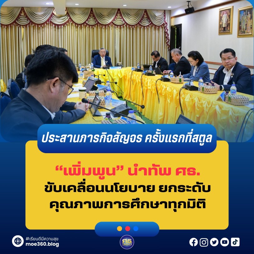 รมว.ศธ. “เพิ่มพูน” เป็นประธานการประชุมประสานภารกิจ ครั้งที่ 5/2568 นำทัพผู้บริหารระดับสูงกระทรวงศึกษาธิการ ลงพื้นที่จังหวัดสตูล ติดตามการขับเคลื่อนนโยบายเพื่อยกระดับคุณภาพการศึกษา PISA และการสอบ O-NET พร้อมวางแนวทางสร้างความฉลาดรู้ทางดิจิทัล (Digital literacy) ให้เยาวชน กำชับผู้บริหารทางการศึกษาในพื้นที่เร่งแก้ไขปัญหาเด็กและเยาวชนหลุดออกจากระบบการศึกษาให้เข้าสู่ระบบครบทุกคนโดยเฉพาะเด็กและเยาวชนที่มีสัญชาติไทย