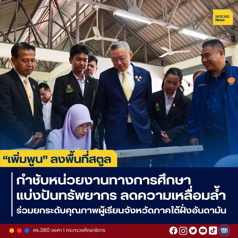 “กระทรวงศึกษาธิการยังคงมุ่งมั่นในการพัฒนาคุณภาพการศึกษา ด้วยการ “ปฏิวัติการศึกษา แก้ปัญหาประเทศ“ เพื่อสร้างการศึกษาที่มุ่งสู่ความเป็นเลิศและเสริมสร้างความมั่นคงของชีวิต โดยเน้นนโยบายลดภาระครูและบุคลากรทางการศึกษา รวมถึงลดภาระของนักเรียนและผู้ปกครอง โดยเฉพาะในกลุ่มจังหวัดภาคใต้ฝั่งอันดามัน ซึ่งถือเป็นพื้นที่สำคัญในการพัฒนาคุณภาพชีวิตและเศรษฐกิจของประเทศ การลงพื้นที่ในครั้งนี้จึงเป็นส่วนหนึ่งของการดำเนินงานที่ช่วยให้รับรู้รับทราบถึงการพัฒนาการศึกษาในแต่ละภูมิภาคได้อย่างชัดเจน และสามารถปรับปรุงและพัฒนานโยบายให้สอดคล้องกับข้อเสนอแนะและความต้องการจากทุกภาคส่วนได้ดียิ่งขึ้น โดยมีเป้าหมายในการยกระดับการศึกษาให้มีคุณภาพ เพื่อการศึกษาที่เท่าเทียม พัฒนาผู้เรียนทุกช่วงวัยให้ “ฉลาดรู้ ฉลาดคิด ฉลาดทำ” ตามนโยบาย “เรียนดี มีความสุข” อย่างยั่งยืนต่อไป”