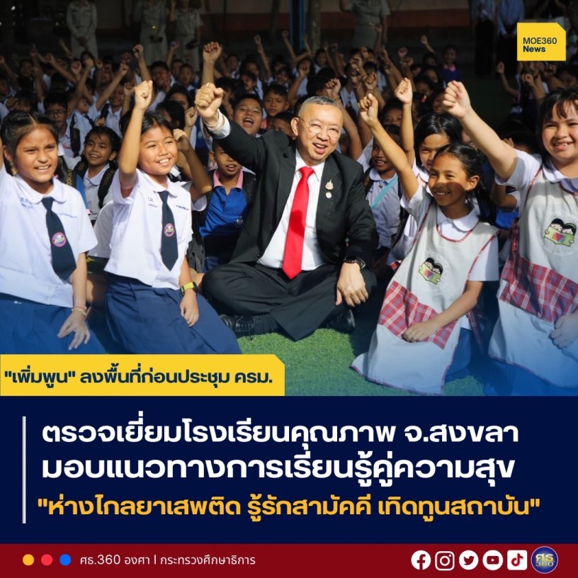 จังหวัดสงขลา, 17 กุมภาพันธ์ 2568 – พลตำรวจเอก เพิ่มพูน ชิดชอบ รัฐมนตรีว่าการกระทรวงศึกษาธิการ พร้อมด้วย นายสิริพงศ์ อังคสกุลเกียรติ ผู้ช่วยรัฐมนตรีประจำกระทรวงศึกษาธิการ นายสุเทพ แก่งสันเทียะ ปลัดกระทรวงศึกษาธิการ และผู้บริหาร ศธ. ลงพื้นที่ตรวจเยี่ยมโรงเรียนคุณภาพ ก่อนการประชุมคณะรัฐมนตรีอย่างเป็นทางการนอกสถานที่ ครั้งที่ 1/2568 กลุ่มจังหวัดภาคใต้ฝั่งอ่าวไทย (จังหวัดชุมพร นครศรีธรรมราช พัทลุง สุราษฎร์ธานี และสงขลา) โดยมีนางสาวอัฐภรณ์ สุทธินวล ผู้อำนวยการโรงเรียนวัดเทพชุมนุม คณะครูและนักเรียน ให้การต้อนรับ ณ โรงเรียนวัดเทพชุมนุม อ.หาดใหญ่ จ.สงขลา