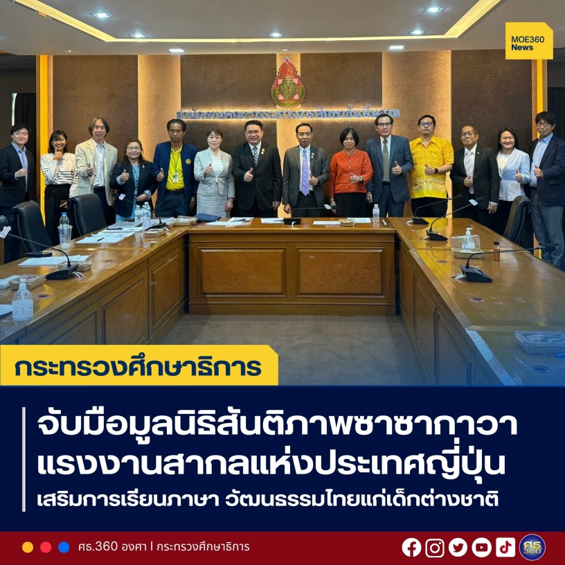 กระทรวงศึกษาธิการ – 20 กุมภาพันธ์ 2568 / นายพิเชฐ โพธิ์ภักดี รองปลัดกระทรวงศึกษาธิการ พร้อมด้วย นายธนากร ดอนเหนือ อธิบดีกรมส่งเสริมการเรียนรู้ นายพัฒนะ พัฒนทวีดล รองเลขาธิการคณะกรรมการการศึกษาขั้นพื้นฐาน และนายธฤติ ประสานสอน รองเลขาธิการสภาการศึกษา ให้การต้อนรับ Ms. Masako IWASHINA ผู้แทนมูลนิธิสันติภาพซาซากาวา (Sasakawa Peace Foundation) Mr.Teruhiro SEKIGUCHI ผู้แทนมูลนิธิแรงงานสากลแห่งประเทศญี่ปุ่น (Japan International Labour Foundation: JILAF) และ Mr. Toshiyuki OKUI ผู้แทนองค์กร Nogezaka Glocal องค์กรไม่แสวงหาผลกำไรของประเทศญี่ปุ่น