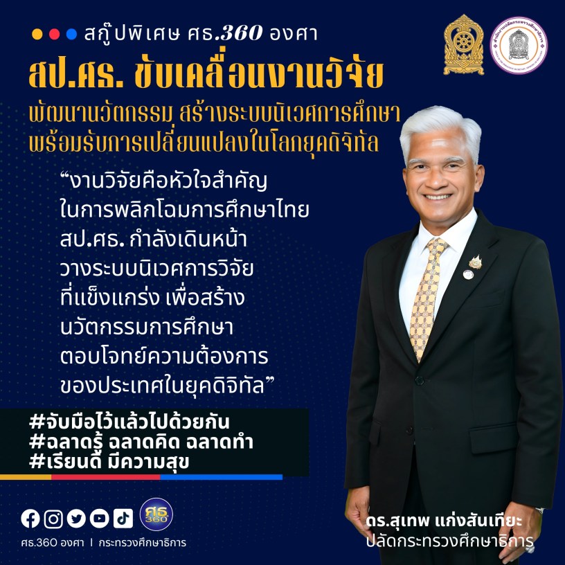 งานวิจัยคือหัวใจสำคัญในการพลิกโฉมการศึกษาไทย สำนักงานปลัดกระทรวงศึกษาธิการ กำลังเดินหน้าวางระบบนิเวศการวิจัยที่แข็งแกร่ง เพื่อสร้างนวัตกรรมการศึกษาที่ตอบโจทย์ความต้องการของประเทศในยุคดิจิทัล และเตรียมความพร้อมให้กับคนไทยสำหรับการก้าวสู่โลกอนาคตอย่างยั่งยืน มาร่วมกันผลักดันงานวิจัยและนวัตกรรมของสำนักงานปลัดกระทรวงศึกษาธิการ เพื่อเป็นส่วนสำคัญในการขับเคลื่อนนโยบายการศึกษาต่อไป หวังเป็นอย่างยิ่งว่าทุกคนจะให้ความร่วมมือและนำแนวทางนโยบายที่สอดคล้องกับสถานการณ์โลกที่เปลี่ยนแปลง รวมถึงบริบทของแต่ละพื้นที่ มาเป็นกรอบในการสรรค์สร้างงานวิจัย และใช้ผลการวิจัยนั้นเป็นข้อมูลในการยกระดับคุณภาพการศึกษาในอนาคต