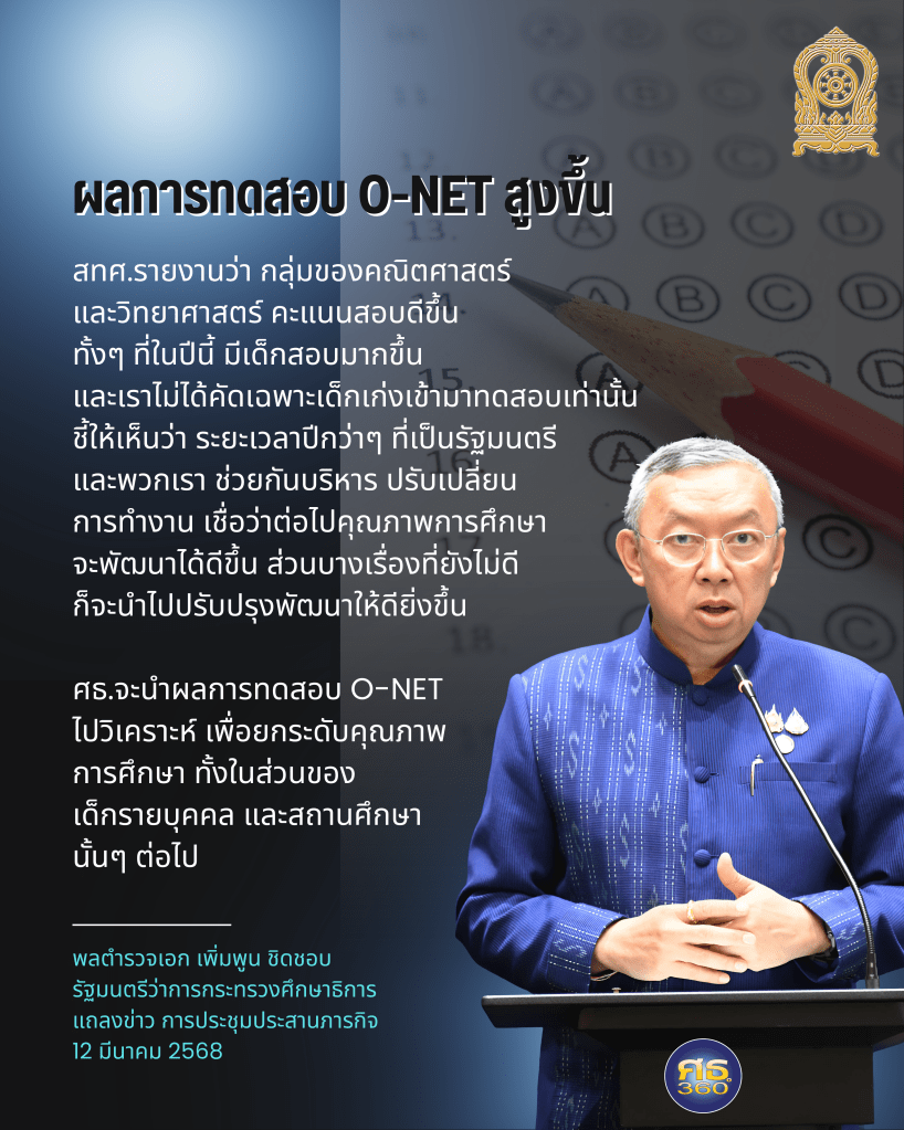 รมว.ศธ. กล่าวว่า สทศ.รายงานผลการทดสอบ O-NET กลุ่มของคณิตศาสตร์ วิทยาศาสตร์ คะแนนสอบดีขึ้น ทั้งๆ ที่ในปีนี้มีเด็กสอบมากขึ้น และเราไม่ได้คัดเฉพาะเด็กเก่งเข้ามาทดสอบเท่านั้น เป็นเครื่องที่ชี้ให้เห็นว่า ระยะเวลาปีกว่าๆ ที่เป็นรัฐมนตรี และพวกเรา ช่วยกันบริหาร ปรับเปลี่ยนการทำงาน เชื่อว่าต่อไปคุณภาพการศึกษาจะพัฒนาได้ดีขึ้น ส่วนบางเรื่องที่ยังไม่ดี ก็จะนำไปปรับปรุงให้ดีขึ้น ซึ่งผลสอบ O-Net เราจะนำมาวิเคราะห์และยกระดับคุณภาพการศึกษา ทั้งในส่วนของเด็กรายบุคคล และสถานศึกษานั้นๆ ด้วย
