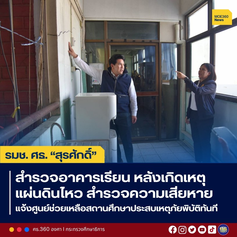 29 มีนาคม 2568 / นายสุรศักดิ์ พันธ์เจริญวรกุล รัฐมนตรีช่วยว่าการกระทรวงศึกษาธิการ กล่าวภายหลังลงพื้นที่สำรวจความเสียหายของอาคารเรียนในพื้นที่กรุงเทพฯและปริมณฑลภายหลังเกิดแผ่นดินไหว ว่า ตนขอเป็นกำลังใจให้กับครู บุคลากรทางการศึกษา ลูกๆนักเรียน และพ่อแม่ผู้ปกครองทุกครอบครัว เราทุกคนจะร่วมแรงร่วมใจกันก้าวข้ามสถานการณ์นี้ไปด้วยกัน อย่างไรก็ตามจากสถานการณ์แผ่นดินไหวทำให้เกิดแรงสั่นสะเทือน ส่งผลให้โรงเรียนในหลายพื้นที่ทั่วประเทศได้รับความเสียหายเกิดรอยแตกร้าว ดังนั้นตนจึงได้สั่งการให้โรงเรียนใน สังกัด สพฐ. และโรงเรียนสังกัดอื่นๆ เร่งรัดทำการสำรวจความเสียหายที่เกิดขึ้น หลังจากนั้นให้รวบรวมข้อมูลความเสียหายทั้งหมด ส่งเข้ามายัง “ศูนย์ปฏิบัติการเฝ้าระวังเพื่อช่วยเหลือสถานศึกษาที่ประสบเหตุภัยพิบัติแผ่นดินไหว สพฐ.” หรือโทร 0 2288 5600 เพื่อให้ความช่วยเหลือโรงเรียนอย่างทันท่วงทีต่อไป