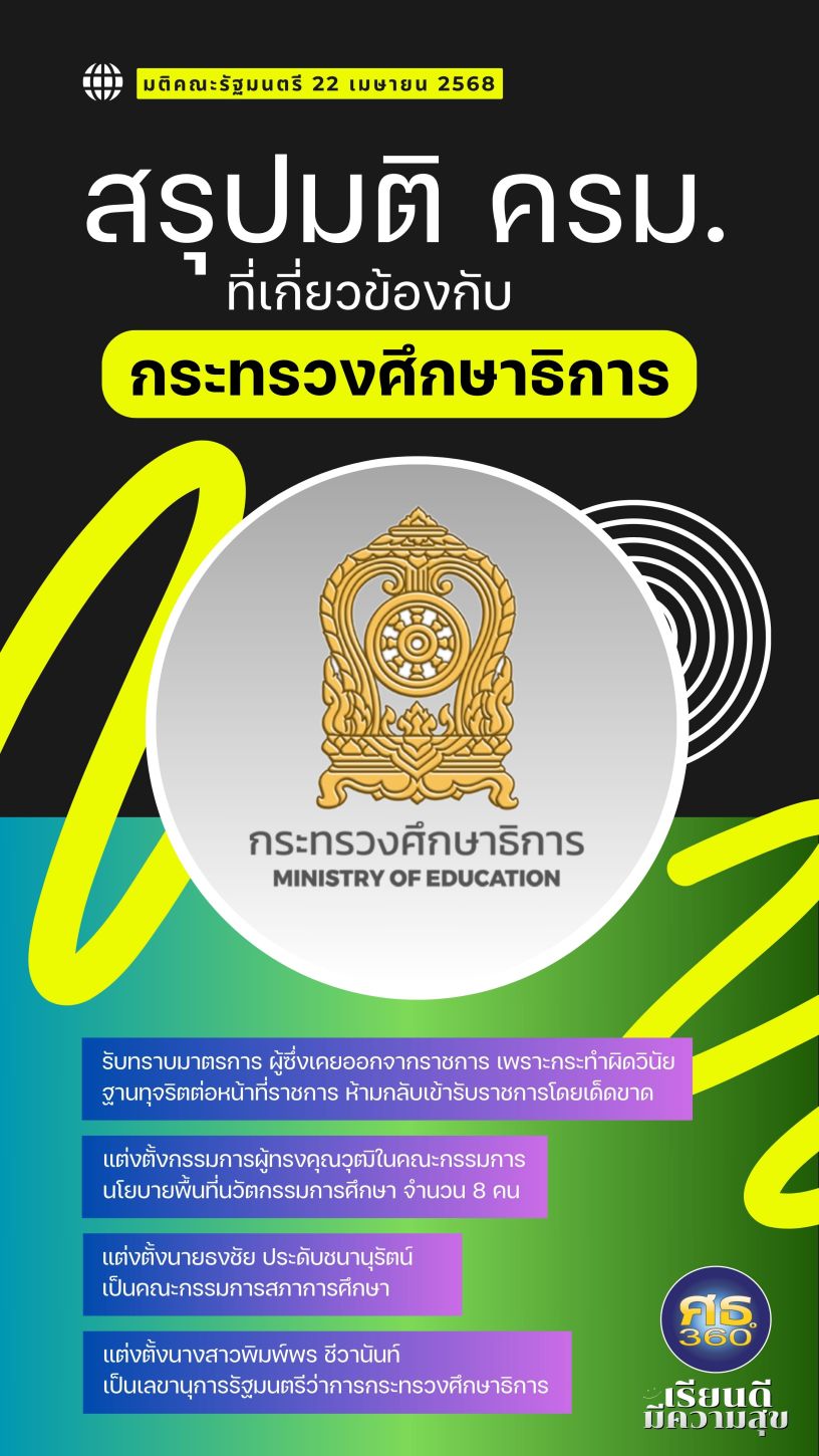 สรุปมติคณะรัฐมนตรี (22 เมษายน 2568) ที่เกี่ยวข้องกับกระทรวงศึกษาธิการ คือ 1) รับทราบมาตรการป้องกันการทุจริตการบรรจุบุคคลผู้ซึ่งเคยออกจากราชการ เพราะกระทำผิดวินัยฐานทุจริตต่อหน้าที่ราชการ ห้ามกลับเข้ารับราชการโดยเด็ดขาด 2) แต่งตั้งกรรมการผู้ทรงคุณวุฒิในคณะกรรมการนโยบายพื้นที่นวัตกรรมการศึกษา จำนวน 8 คน 3) แต่งตั้งนายธงชัย ประดับชนานุรัตน์ เป็นกรรมการที่เป็นผู้แทนองค์กรศาสนาอื่นในคณะกรรมการสภาการศึกษา 4) แต่งตั้งนางสาวพิมพ์พร ชีวานันท์ เป็นเลขานุการรัฐมนตรีว่าการกระทรวงศึกษาธิการ