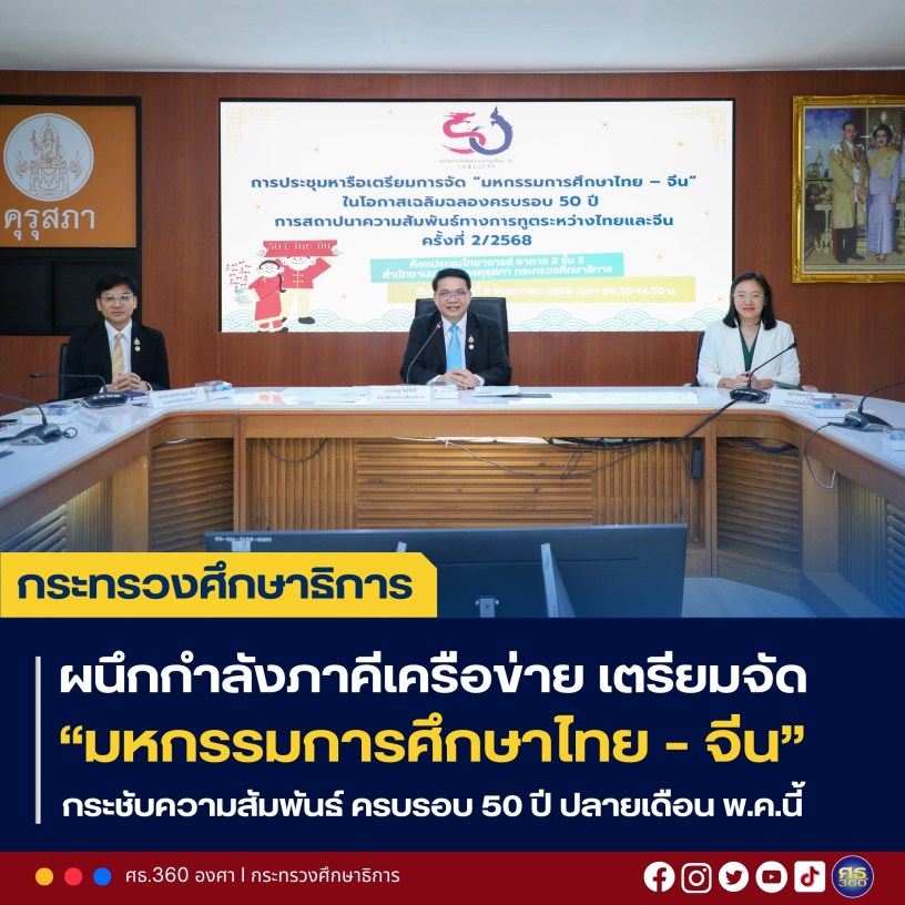 รองปลัด ศธ. กล่าวว่า กระทรวงศึกษาธิการ เตรียมการจัด “มหกรรมการศึกษาไทย – จีน” เพื่อเฉลิมฉลองวาระครบรอบ 50 ปี การสถาปนาความสัมพันธ์ทางการทูตระหว่างราชอาณาจักรไทยและสาธารณรัฐประชาชนจีน ในวันอาทิตย์ที่ 25 พฤษภาคม 2568 ณ เซ็นทรัลเวิลด์ ไลฟ์ ชั้น 8 ศูนย์การค้าเซ็นทรัลเวิลด์ กรุงเทพมหานคร