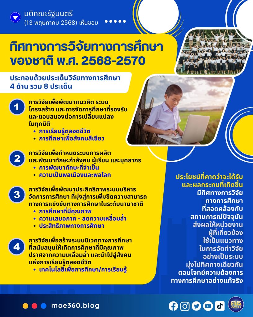 มติคณะรัฐมนตรี (13 พฤษภาคม 2568) เห็นชอบทิศทางการวิจัยทางการศึกษาของชาติ พ.ศ. 2568 – 2570 (ทิศทางการวิจัยทางการศึกษาฯ) รวมทั้งมอบหมายหน่วยงานที่เกี่ยวข้องทั้งหน่วยงานให้ทุน1 และหน่วยงานทำวิจัยนำทิศทางการวิจัยทางการศึกษาฯ ไปใช้เป็นกรอบในการพิจารณาให้ทุนและจัดทำงานวิจัยทางการศึกษาตามภารกิจของแต่ละหน่วยงาน ตามที่กระทรวงศึกษาธิการ (ศธ.) เสนอ