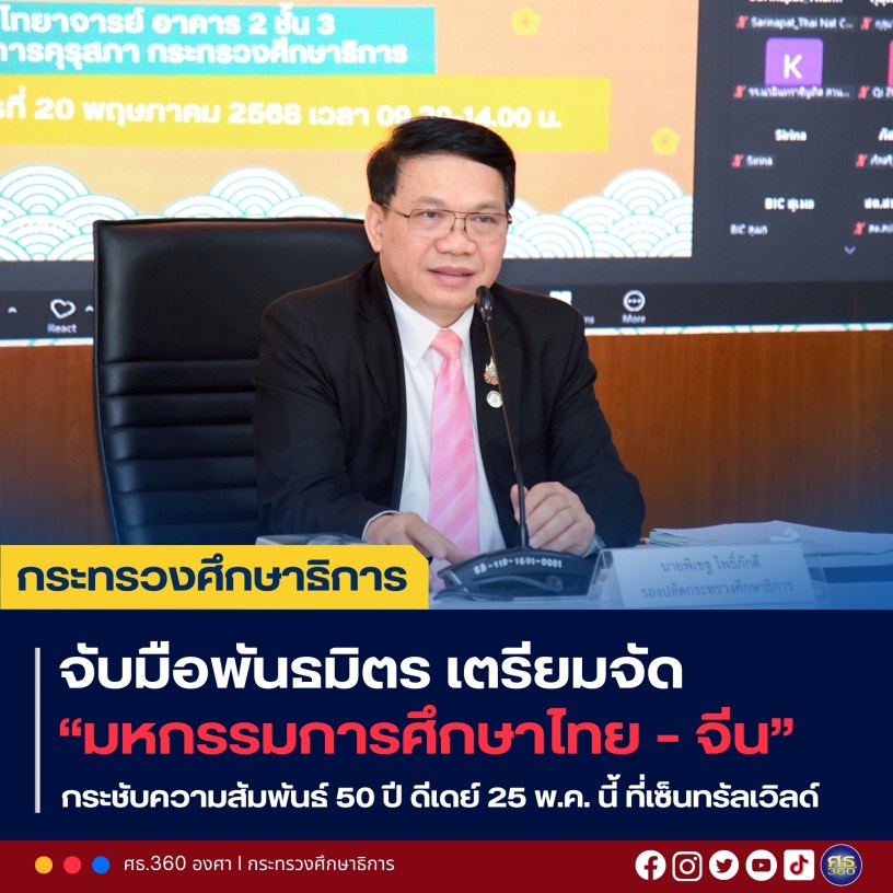 กระทรวงศึกษาธิการ – 20 พฤษภาคม 2568 / พลตำรวจเอก เพิ่มพูน ชิดชอบ รัฐมนตรีว่าการกระทรวงศึกษาธิการ มอบหมายให้ นายพิเชฐ โพธิ์ภักดี รองปลัดกระทรวงศึกษาธิการ เป็นประธานการประชุมหารือเตรียมการจัดมหกรรมการศึกษาไทย-จีน ในโอกาสเฉลิมฉลองครบรอบ 50 ปี การสถาปนาความสัมพันธ์ทางการทูตระหว่างไทยและจีน ครั้งที่ 3/2568 ณ ห้องประชุมไทยาจารย์ สำนักงานเลขาธิการคุรุสภา