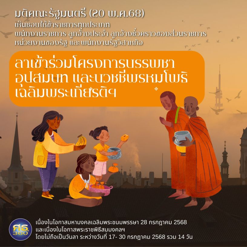 มติคณะรัฐมนตรี (20 พฤษภาคม 2568) เห็นชอบให้ข้าราชการทุกประเภท พนักงานราชการ ลูกจ้างประจำ ลูกจ้างชั่วคราวของส่วนราชการ หน่วยงานของรัฐ และพนักงานรัฐวิสาหกิจ ลาเข้าร่วมโครงการบรรพชาอุปสมบทและบวชชีพรหมโพธิเฉลิมพระเกียรติพระบาทสมเด็จพระเจ้าอยู่หัว เนื่องในโอกาสมหามงคลเฉลิมพระชนมพรรษา 28 กรกฎาคม 2568 และเนื่องในโอกาสพระราชพิธีสมมงคลพระชนมายุเท่าพระบาทสมเด็จพระพุทธยอดฟ้าจุฬาโลกมหาราช สมเด็จพระปฐมบรมกษัตริยาธิราชแห่งพระราชวงศ์จักรี พุทธศักราช 2568 โดยไม่ถือเป็นวันลา (ระหว่างวันที่ 17 – 30 กรกฎาคม 2568 รวม 14 วัน)