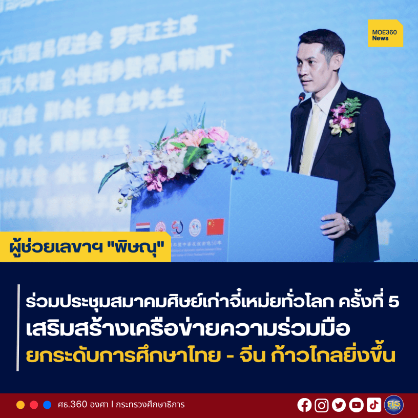 15 มิถุนายน 2568 – นายพิษณุ พลธี ผู้ช่วยเลขานุการ รมว.ศธ. ได้รับมอบหมายจากพลตำรวจเอก เพิ่มพูน ชิดชอบ รมว.ศธ. เข้าร่วมการประชุมสมาคมศิษย์เก่าจี๋เหม่ยทั่วโลก ครั้งที่ 5 และพิธีรับมอบตำแหน่งนายกและคณะกรรมการบริหารสมาคมศิษย์เก่าโรงเรียนจี๋เหม่ยแห่งประเทศไทย สมัยที่ 23 โดยมีอธิการบดีจากสถานศึกษาของไทย ผู้แทนจากสถานเอกอัครราชทูตสาธารณรัฐประชาชนจีนประจำประเทศไทย ประธานหอการค้าไทย-จีน และนายจ้าว หมิงกวง ประธานสมาคมศิษย์เก่าจี๋เหม่ยทั่วโลก และสมาคมต่าง ๆ เข้าร่วม ณ หอการค้าไทย-จีน อาคารไทยซีซี กรุงเทพฯ