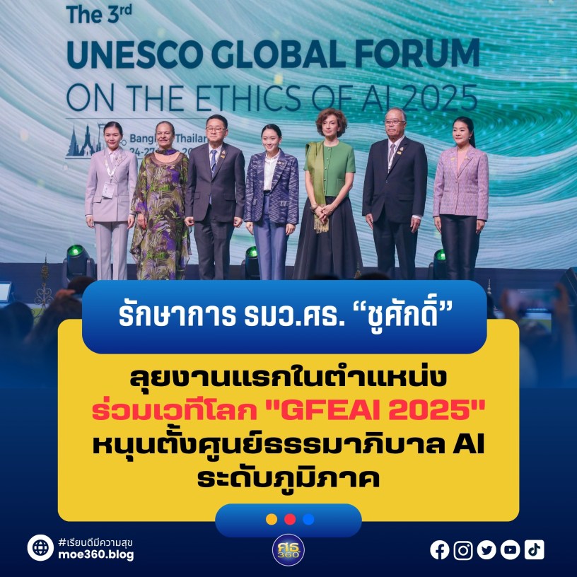 รักษาราชการแทน รมว.ศธ. “ชูศักดิ์” ลุยงานแรก ร่วมเวทีโลก GFEAI 2025 หนุนตั้งศูนย์ธรรมาภิบาล AI ระดับภูมิภาค โดยนายกรัฐมนตรี “แพทองธาร” นำประเทศไทยในฐานะเจ้าภาพการประชุมระดับโลก ภายใต้ 3 กระทรวงหลัก กระทรวงศึกษาธิการ (ศธ.) กระทรวงดิจิทัลเพื่อเศรษฐกิจและสังคม (ดีอี) และกระทรวงการอุดมศึกษา วิทยาศาสตร์ วิจัยและนวัตกรรม (อว.) จับมือ องค์การการศึกษา วิทยาศาสตร์และวัฒนธรรมแห่งสหประชาชาติ (UNESCO) เปิดการประชุมวิชาการนานาชาติ “The 3rd UNESCO Global Forum on the Ethics of AI 2025” จัดขึ้นระหว่างวันที่ 24 – 27 มิถุนายน 2568 มีผู้เข้าร่วมกว่า 104 ชาติ ประเทศไทยร่วมแสดงบทบาทผู้นำระดับภูมิภาคในการพัฒนา AI อย่างมีจริยธรรม พร้อมเดินหน้าพัฒนา AI อย่างมีธรรมาภิบาล เพื่อให้เกิดประโยชน์กับทุกคนอย่างเท่าเทียม