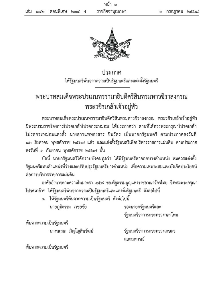 พระบาทสมเด็จพระปรเมนทรรามาธิบดีศรีสินทรมหาวชิราลงกรณ พระวชิรเกล้าเจ้าอยู่หัว มีพระบรมราชโองการโปรดเกล้าโปรดกระหม่อม ให้ประกาศว่า ตามที่ได้ทรงพระกรุณาโปรดเกล้า โปรดกระหม่อมแต่งตั้ง นางสาวแพทองธาร ชินวัตร เป็นนายกรัฐมนตรี ตามประกาศลงวันที่ ๑๖ สิงหาคม พุทธศักราช ๒๕๖๗ แล้ว และแต่งตั้งรัฐมนตรีเพื่อบริหารราชการแผ่นดิน ตามประกาศ ลงวันที่ ๓ กันยายน พุทธศักราช ๒๕๖๗ นั้น
