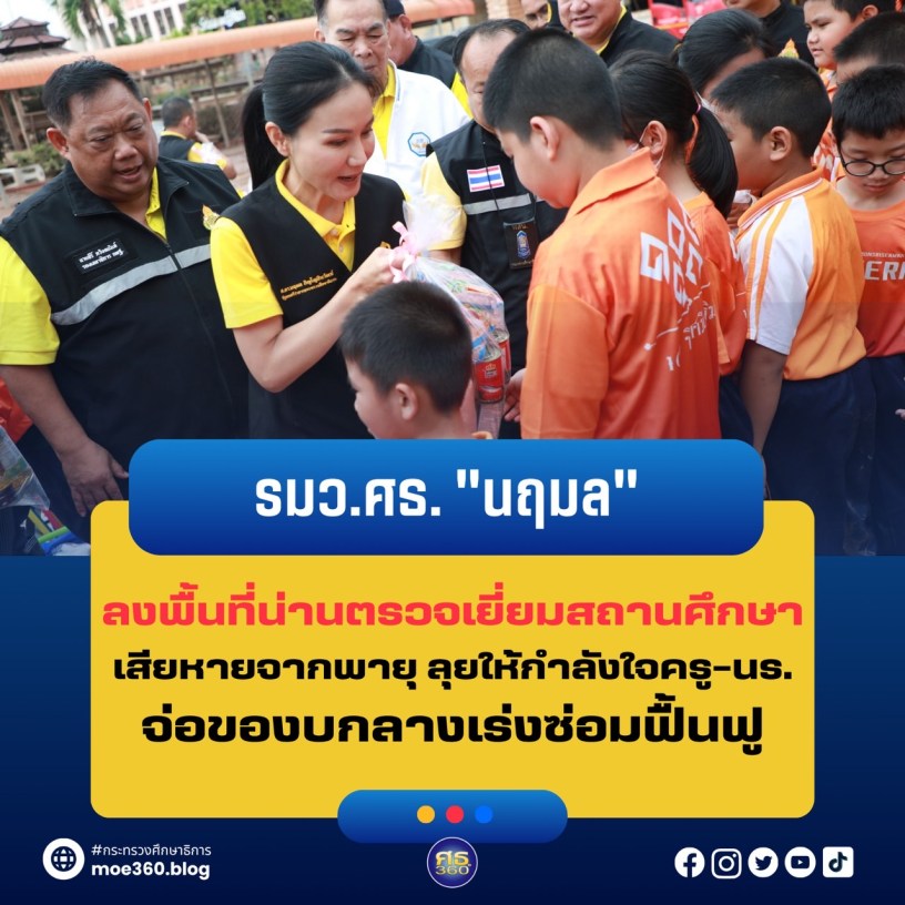 จังหวัดน่าน – 1 สิงหาคม 2568 นางนฤมล ภิญโญสินวัฒน์ รัฐมนตรีว่าการกระทรวงศึกษาธิการ พร้อมด้วย ว่าที่ร้อยตรี ธนุ วงษ์จินดา เลขาธิการคณะกรรมการการศึกษาขั้นพื้นฐาน (สพฐ.) และนายยศพล เวณุโกเศศ เลขาธิการคณะกรรมการการอาชีวศึกษา (สอศ.) ลงพื้นที่ตรวจเยี่ยมสถานศึกษาที่ได้รับผลกระทบจากพายุโซนร้อนวิภา ซึ่งได้สร้างความเสียหายให้กับโรงเรียนและวิทยาลัยหลายแห่งในพื้นที่