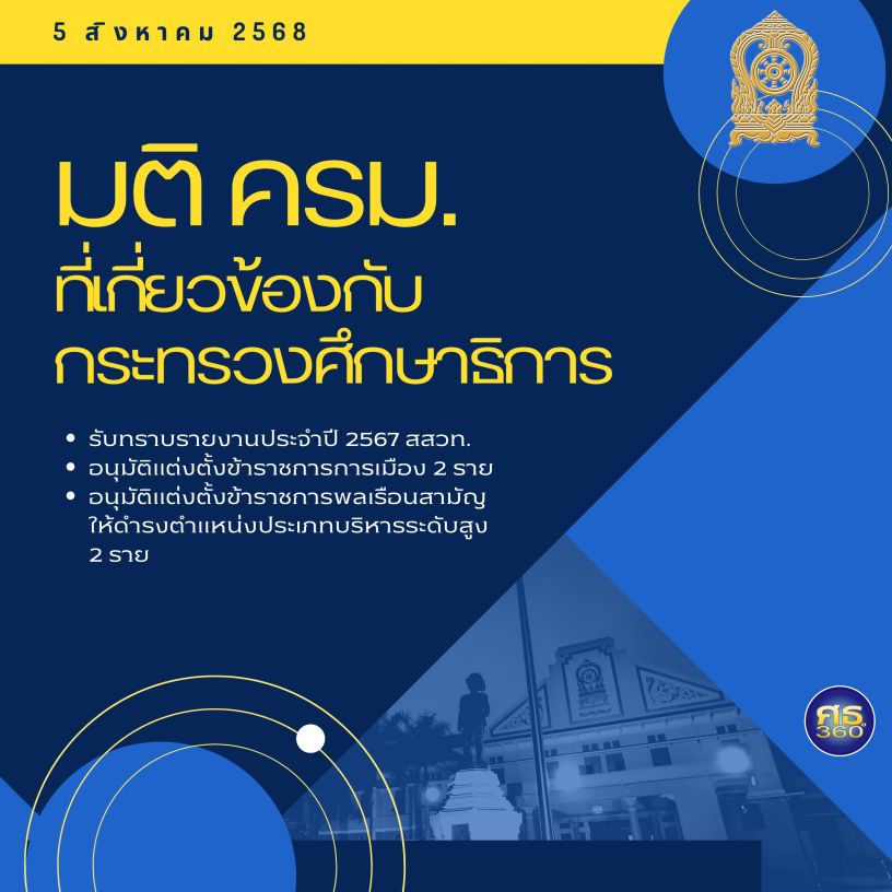สรุปมติคณะรัฐมนตรี (5 สิงหาคม 2568) ที่เกี่ยวข้องกับกระทรวงศึกษาธิการ 3 เรื่อง คือ 1) รับทราบรายงานประจำปี 2567 สสวท. 2) อนุมัติแต่งตั้งข้าราชการการเมือง 2 ราย 3) อนุมัติแต่งตั้งข้าราชการพลเรือนสามัญให้ดำรงตำแหน่งประเภทบริหารระดับสูง 2 ราย