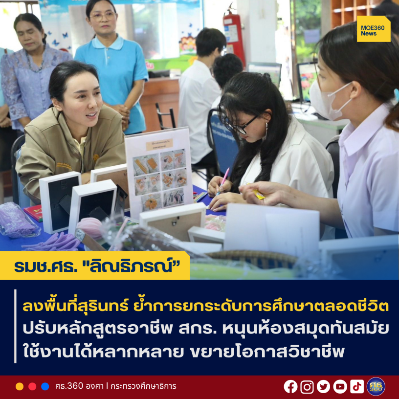 16 สิงหาคม 2568 — นางสาวลิณธิภรณ์ วริณวัชรโรจน์ รัฐมนตรีช่วยว่าการกระทรวงศึกษาธิการ ลงพื้นที่ติดตามการดำเนินงานของสำนักงานส่งเสริมการเรียนรู้และสถานศึกษาในจังหวัดสุรินทร์ พร้อมมอบนโยบายสำคัญเพื่อยกระดับการศึกษาตลอดชีวิต โดยมุ่งเน้นการสร้างโอกาสและคุณภาพการศึกษาให้สอดคล้องกับความต้องการของประชาชนและตลาดแรงงาน โดยมีผู้อำนวยการสำนักงานส่งเสริมการเรียนรู้ประจำจังหวัด คณะวิทยากร ผู้บริหารสถานศึกษา และครูในพื้นที่ เข้าร่วมรับฟังนโยบายอย่างพร้อมเพรียง