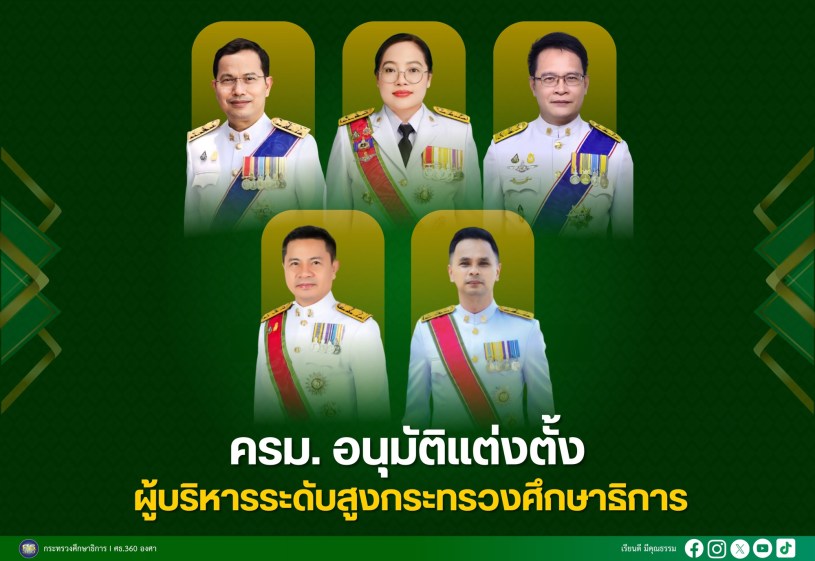 ที่ประชุมคณะรัฐมนตรี (19 สิงหาคม 2568) มีมติอนุมัติตามที่กระทรวงศึกษาธิการ (ศธ.) เสนอแต่งตั้ง ข้าราชการพลเรือนสามัญ สังกัดกระทรวงศึกษาธิการ ให้ดำรงตำแหน่งประเภทบริหารระดับสูงจำนวน 5 ราย เพื่อทดแทนผู้ดำรงตำแหน่งที่จะเกษียณอายุราชการ และสับเปลี่ยนหมุนเวียน ดังนี้