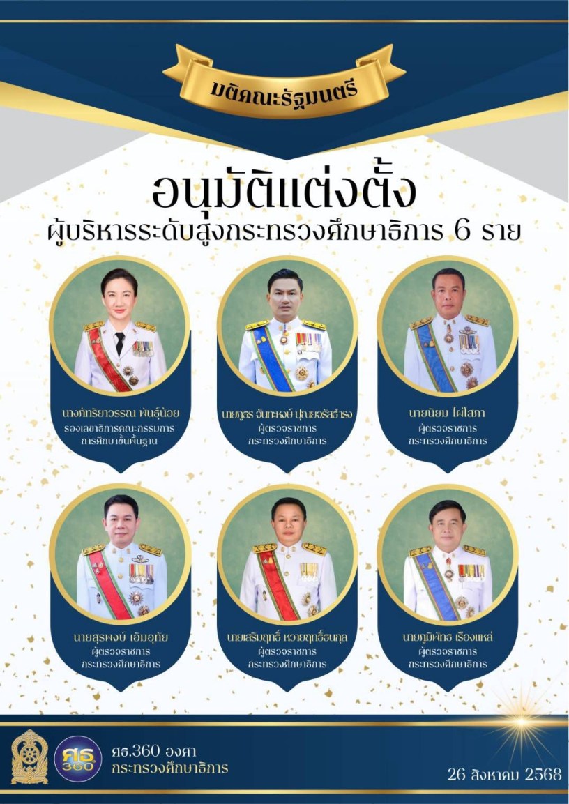 ศาสตราจารย์นฤมล ภิญโญสินวัฒน์ รัฐมนตรีว่าการกระทรวงศึกษาธิการ เปิดเผยภายหลังการประชุมคณะรัฐมนตรี (ครม.) ว่า ที่ประชุมคณะรัฐมนตรี (26 สิงหาคม 2568) มีมติอนุมัติตามที่กระทรวงศึกษาธิการ (ศธ.) เสนอแต่งตั้ง ข้าราชการพลเรือนสามัญ สังกัดกระทรวงศึกษาธิการ ให้ดำรงตำแหน่งประเภทบริหารระดับสูง จำนวน 6 ราย เพื่อทดแทนผู้ดำรงตำแหน่งที่จะเกษียณอายุราชการ และทดแทนตำแหน่งที่ว่าง ดังนี้