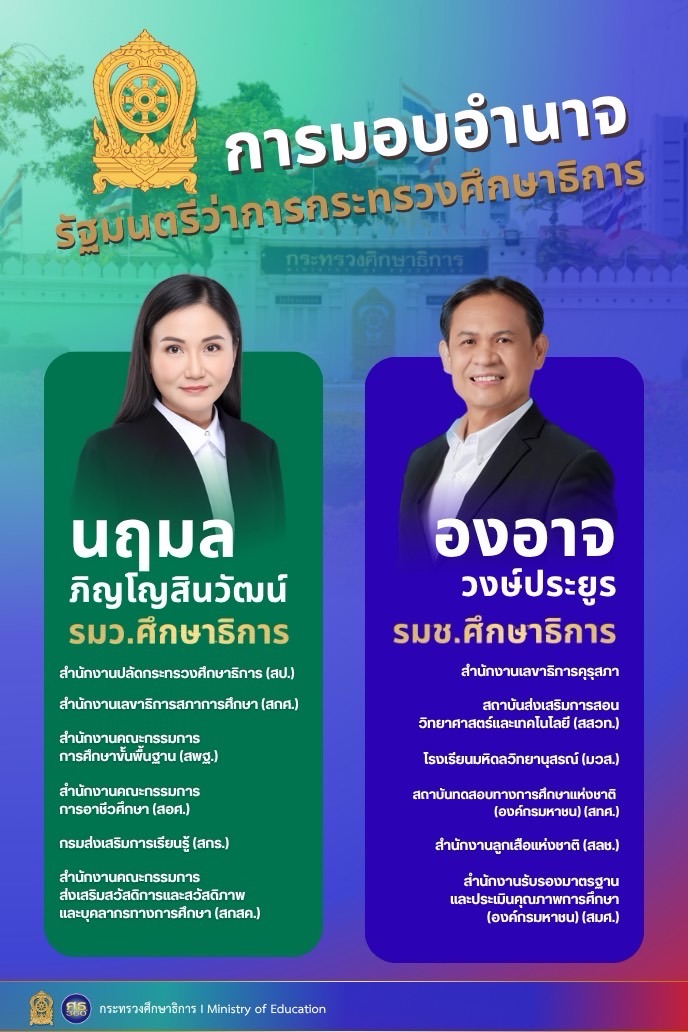 เมื่อวันที่ 1 ตุลาคม 2568 นางนฤมล ภิญโญสินวัฒน์ รัฐมนตรีว่าการกระทรวงศึกษาธิการ ลงนามในคำสั่งมอบอำนาจให้รัฐมนตรีช่วยว่าการกระทรวงศึกษาธิการสั่งและปฏิบัติราชการแทน เพื่อให้การบริหารราชการของกระทรวงศึกษาธิการ เป็นไปด้วยความเรียบร้อย รวดเร็ว และมีประสิทธิภาพ