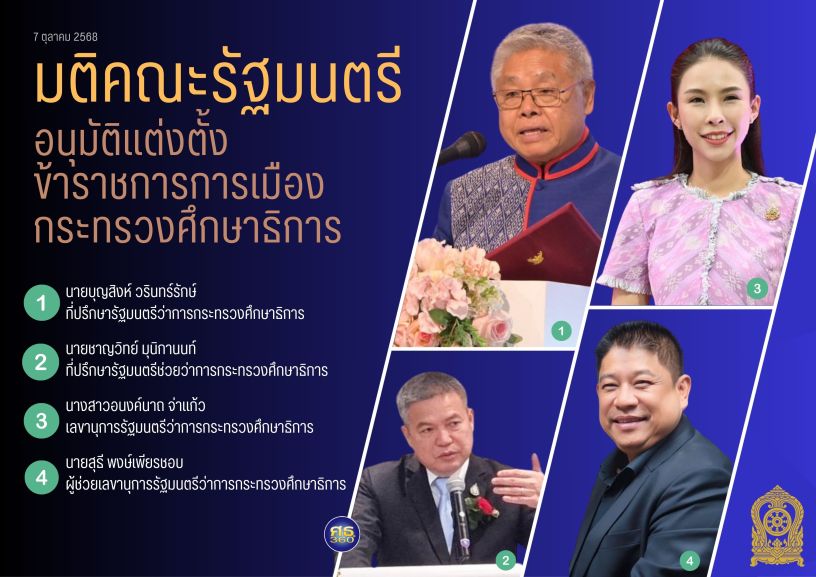 มติคณะรัฐมนตรี (7 ตุลาคม 2568) เกี่ยวข้องกับกระทรวงศึกษาธิการ มีมติอนุมัติตามที่กระทรวงศึกษาธิการ เสนอแต่งตั้งข้าราชการการเมือง จำนวน 4 ราย ดังนี้