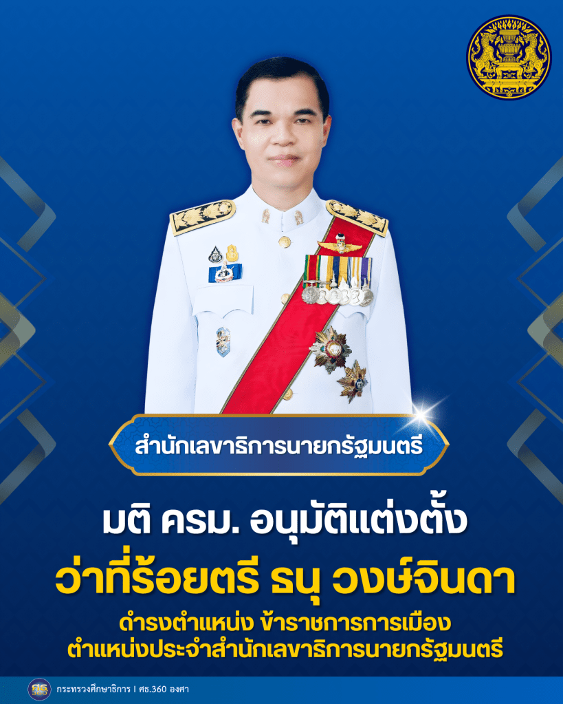สรุปมติคณะรัฐมนตรี (21 ตุลาคม 2568) ในส่วนที่เกี่ยวข้องกับกระทรวงศึกษาธิการ มีมติอนุมัติตามที่สำนักเลขาธิการนายกรัฐมนตรีเสนอ แต่งตั้งบุคคลให้ดำรงตำแหน่งข้าราชการการเมือง ตำแหน่งประจำสำนักเลขาธิการนายกรัฐมนตรี จำนวน 4 ราย ตั้งแต่วันที่ 21 ตุลาคม 2568 เป็นต้นไป ดังนี้