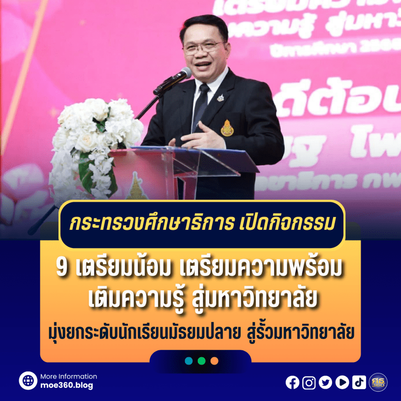 3 พฤศจิกายน 2568 – กระทรวงศึกษาธิการ โดย สพฐ. เปิดกิจกรรม “9 เตรียมน้อม เตรียมความพร้อม เติมความรู้ สู่มหาวิทยาลัย” ปีการศึกษา 2568 มุ่งยกระดับผลสัมฤทธิ์ทางการเรียนของนักเรียนมัธยมปลาย สู่ความพร้อมเข้ามหาวิทยาลัย โดยมี นายพิเชฐ โพธิ์ภักดี เลขาธิการคณะกรรมการการศึกษาขั้นพื้นฐาน เป็นประธานในพิธีเปิด พร้อมด้วยผู้บริหารการศึกษา ผู้บริหารสถานศึกษา คณะครู นักเรียน และผู้เกี่ยวข้อง เข้าร่วมงาน ณ หอประชุม 100 ปี สมเด็จย่า โรงเรียนนวมินทราชินูทิศ เตรียมอุดมศึกษาน้อมเกล้า กรุงเทพมหานคร