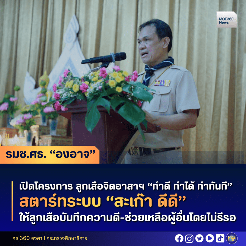 “หลักการของลูกเสือ ไม่ใช่แค่การท่องจำ คำปฏิญาณที่ว่า “ข้าจะช่วยเหลือผู้อื่นทุกเมื่อ” แต่ต้องถูกแปลง เป็นการกระทำที่เป็นจริงและทันเวลา พร้อมขอมอบนโยบายสำคัญเพื่อขับเคลื่อนการดำเนินงานลูกเสือทั่วประเทศให้เข้มแข็ง คือ นโยบาย “ลูกเสือช่วยเหลือผู้อื่นทุกเมื่อ ทำดี ทำได้ ทำทันที” โดยการ “ทำดี” ต้องเน้นคุณภาพและความสม่ำเสมอ ยึดมั่นในคุณธรรม ความซื่อสัตย์สุจริต และความมีวินัยตามกฎของลูกเสือ ส่วนการ “ทำได้” จะเน้นที่ทักษะและความสามารถ เพื่อใช้ช่วยเหลือผู้อื่นได้อย่างแท้จริง และมีประสิทธิภาพ เช่น การปฐมพยาบาลเบื้องต้น การช่วยเหลือฉุกเฉิน รวมทั้งการ “ทำทันที” เน้นความรวดเร็วและความตื่นตัว เป็นหัวใจของนโยบาย ที่จะต้องเป็นคนช่างสังเกต ตื่นตัวต่อปัญหาและความเดือดร้อนของผู้อื่น จงอย่ารีรอ อย่าเพิกเฉย ต่อความเดือดร้อนตรงหน้า โดย สลช. ได้พัฒนาระบบบันทึกความดี หรือ scoutdd (สะเก๊า ดีดี) เพื่อบันทึกและรวบรวมผลงานความดีของตนเองและกองลูกเสือได้อย่างเป็นระบบ”