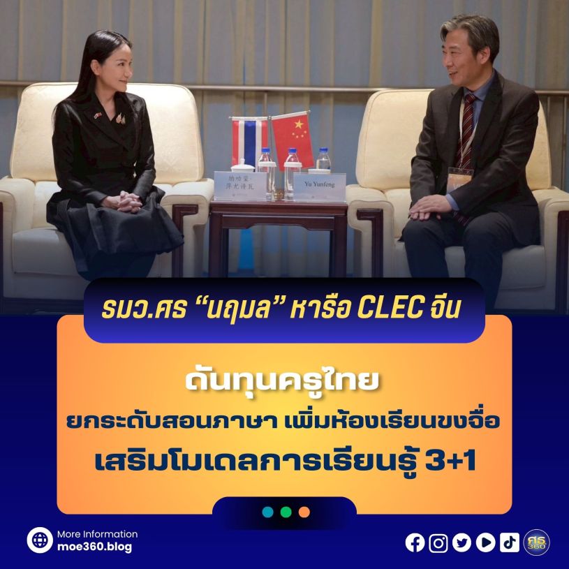 16 พฤศจิกายน 2568 – ศาสตราจารย์นฤมล ภิญโญสินวัฒน์ รัฐมนตรีว่าการกระทรวงศึกษาธิการ(รมว.ศธ.) เปิดเผยว่า ตนพร้อมด้วยผู้บริหารกระทรวงศึกษาธิการ ได้เข้าพบหารือกับ Mr. Yu Yunfeng ผู้อำนวยการศูนย์แลกเปลี่ยนและส่งเสริมความร่วมมือด้านภาษาจีนระหว่างประเทศ (Center for Language Education and Cooperation: CLEC) ณ กรุงปักกิ่ง ระหว่างการประชุมภาษาจีนโลก ประจำปี 2568 ณ ศูนย์การประชุมแห่งชาติจีน สาธารณรัฐประชาชนจีน