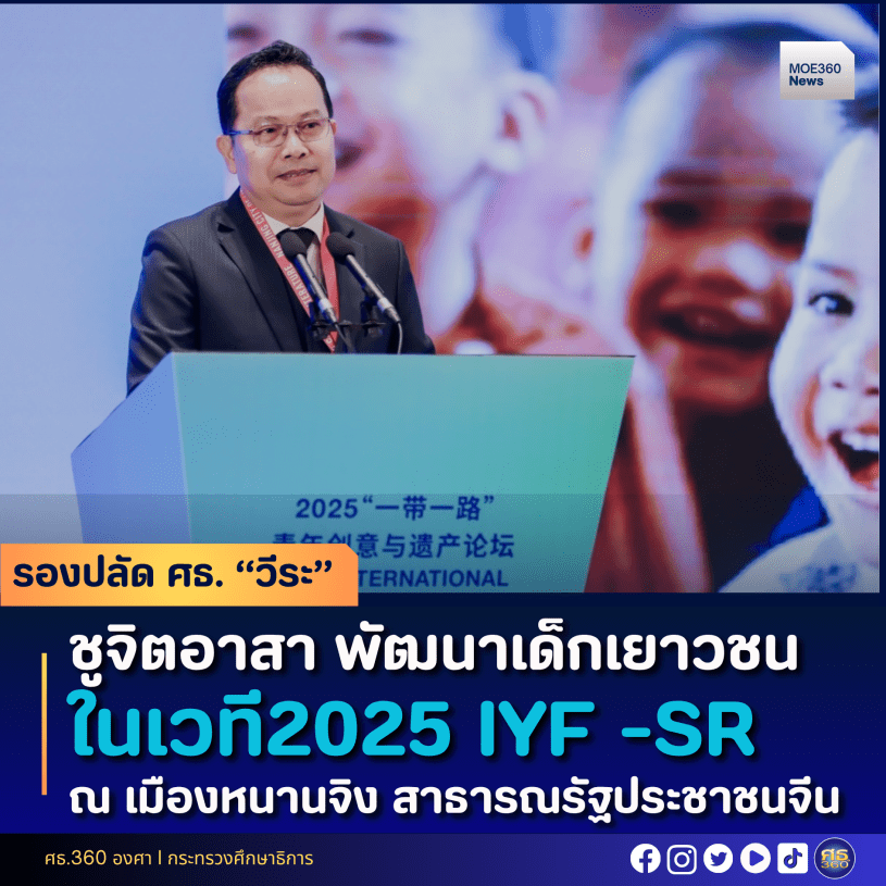 17 พฤศจิกายน 2568 – ปลัดกระทรวงศึกษาธิการมอบหมายให้ นายวีระ แข็งกสิการ รองปลัดกระทรวงศึกษาธิการ เข้าร่วมประชุมในงาน 2025 International Youth Forum on Creativity and Heritage along the Silk Roads (IYF-SR) โดยมีผู้นำเยาวชนและผู้เข้าร่วมงาน ในกิจกรรมด้านมรดกทางวัฒนธรรมจำนวนกว่า 100 คน จาก 50 ประเทศ เข้าร่วม ณ เมืองหนานจิง สาธารณรัฐประชาชนจีน