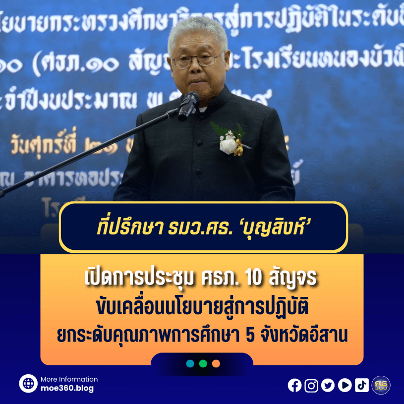หนองบัวลำภู – 21 พฤศจิกายน 2568 รัฐมนตรีว่าการกระทรวงศึกษาธิการ มอบหมายให้ นายบุญสิงห์ วรินทร์รักษ์ ที่ปรึกษารัฐมนตรีว่าการกระทรวงศึกษาธิการ เป็นประธานเปิดการประชุมขับเคลื่อนนโยบายของกระทรวงศึกษาธิการสู่การปฏิบัติในระดับพื้นที่สำนักงานศึกษาธิการภาค 10 (ศธภ.10 สัญจร) ประจำปีงบประมาณ พ.ศ. 2569 เพื่อจัดการศึกษาที่มีคุณภาพ รวมถึงสร้างการรับรู้ และกำหนดแนวทางการพัฒนาการบริหารจัดการในการขับเคลื่อนนโยบายสู่การปฏิบัติให้เป็นไปในทิศทางเดียวกัน