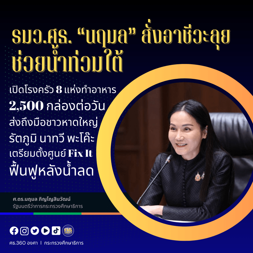 24 พฤศจิกายน 2568 – น.ศ.ดร.นฤมล ภิญโญสินวัฒน์ รัฐมนตรีว่าการกระทรวงศึกษาธิการ กล่าวถึงวิกฤตสถานการณ์น้ำท่วมที่ยังส่งผลกระทบอย่างหนักในหลายจังหวัดภาคใต้ว่า กระทรวงศึกษาธิการได้ระดมกำลังทุกวิทยาลัยอาชีวศึกษาลงพื้นที่ช่วยเหลือประชาชนอย่างเต็มกำลัง เพื่อบรรเทาความเดือดร้อนเร่งด่วนในพื้นที่ โดยขณะนี้ได้สั่งการให้วิทยาลัยอาชีวศึกษาในจังหวัดสงขลา 5 แห่ง เปิดโรงครัวประกอบอาหารแห่งละ 500 กล่อง รวมกว่า 2,500 กล่องต่อวัน ส่งกระจายให้ประชาชนตามพื้นที่ที่ได้รับผลกระทบในอำเภอหาดใหญ่ อำเภอรัตภูมิ อำเภอนาทวี และอำเภอพะโค๊ะ เพื่อให้ชาวบ้านที่ติดอยู่ในจุดเสี่ยงต่าง ๆ ได้รับอาหารและน้ำดื่มอย่างทั่วถึง พร้อมกันนี้ ได้ประสานวิทยาลัยจากจังหวัดสุราษฎร์ธานีอีก 3 วิทยาลัย เข้าตั้งโรงครัวเสริมในพื้นที่ศูนย์พักพิงที่จังหวัดจัดตั้งขึ้น เพื่อรองรับผู้ประสบภัยที่อพยพออกมาจากพื้นที่น้ำท่วมลึก
