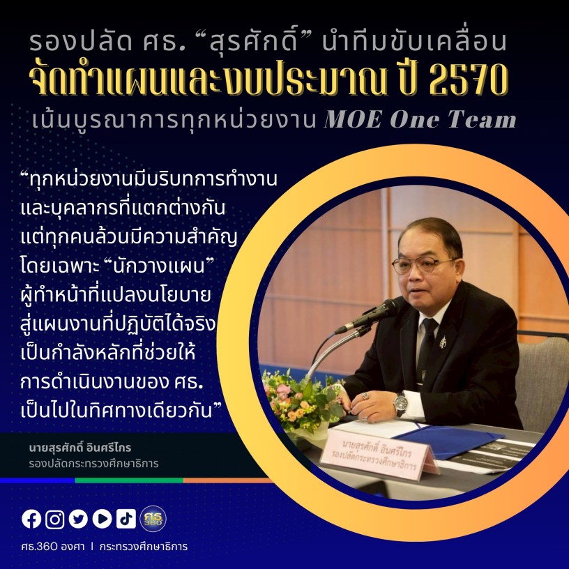 26 พฤศจิกายน 2568 / นายสุเทพ แก่งสันเทียะ ปลัดกระทรวงศึกษาธิการ มอบหมายให้ นายสุรศักดิ์ อินศรีไกร รองปลัดกระทรวงศึกษาธิการ เป็นประธานการประชุมเชิงปฏิบัติการจัดทำ (ร่าง) สาระสำคัญของแผนปฏิบัติราชการ และ (ร่าง) การทบทวนเป้าหมายการให้บริการของกระทรวงศึกษาธิการ ประจำปีงบประมาณ พ.ศ. 2570 โดยมีนายสุรชัย คุ้มสมบัติ ผู้อำนวยการสำนักนโยบายและยุทธศาสตร์ สป. ผู้แทนจากองค์กรหลักและหน่วยงานในกำกับที่รับผิดชอบการทำแผนและงบประมาณ ตลอดจนวิทยากรจากสำนักงบประมาณ ให้การต้อนรับและเข้าร่วม ณ โรงแรมรอยัล ริเวอร์ กรุงเทพมหานคร