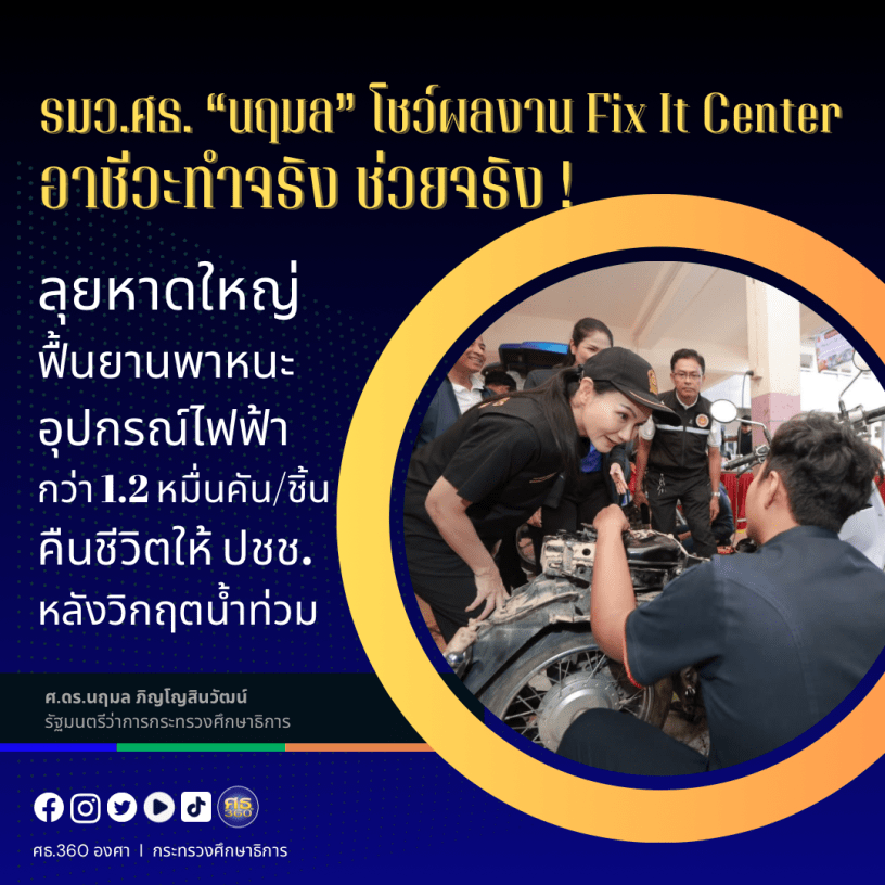 4 ธันวาคม 2568 – ศ.ดร.นฤมล ภิญโญสินวัฒน์ รัฐมนตรีว่าการกระทรวงศึกษาธิการ เปิดเผยผลการดำเนินงานของศูนย์ซ่อมสร้างเพื่อชุมชน (Fix It Center) ภายใต้สำนักงานคณะกรรมการการอาชีวศึกษา (สอศ.) ที่ระดมครูและนักศึกษาอาชีวศึกษาจากหลายสถาบันลงพื้นที่ช่วยเหลือประชาชนผู้ประสบอุทกภัยในจังหวัดสงขลาอย่างเร่งด่วน โดยให้บริการซ่อมแซมเครื่องใช้ไฟฟ้า รถจักรยานยนต์ รถยนต์ รวมถึงอุปกรณ์ประกอบอาชีพที่ได้รับความเสียหายจากน้ำท่วม