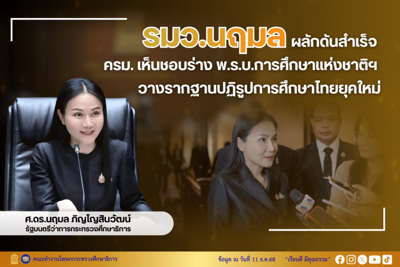 11 ธันวาคม 2568 – ว่าที่ร้อยตรี ธนุ วงษ์จินดา โฆษกกระทรวงศึกษาธิการ เปิดเผยผลการประชุมคณะรัฐมนตรีของวันอังคารที่ 9 ธันวาคม 2568 ที่ผ่านมาว่า ที่ประชุมคณะรัฐมนตรีได้ เห็นชอบร่างพระราชบัญญัติการศึกษาแห่งชาติ พ.ศ. … ตามที่กระทรวงศึกษาธิการเสนอ ซึ่งถือเป็นความก้าวหน้าครั้งสำคัญของการขับเคลื่อนการปฏิรูปการศึกษาไทย และเป็นรากฐานสำคัญในการพัฒนาคุณภาพผู้เรียนทุกช่วงวัยในระยะยาว