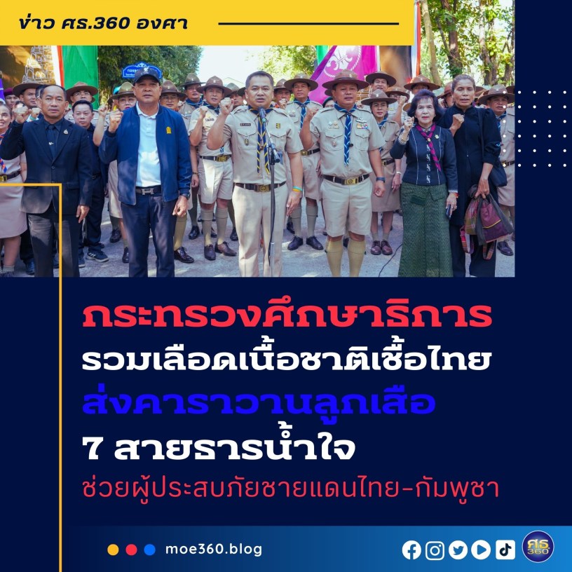 “การดำเนินโครงการคาราวาน “ลูกเสือช่วยผู้ประสบภัยชายแดนไทย–กัมพูชา” ในครั้งนี้ นับเป็นอีกหนึ่งบทพิสูจน์ของพลังความร่วมมือจากทุกภาคส่วนภายใต้กระทรวงศึกษาธิการ ที่ร่วมกันขับเคลื่อนอุดมการณ์ของกิจการลูกเสือไทยให้เกิดผลเป็นรูปธรรม ผ่านการลงมือปฏิบัติจริงเพื่อช่วยเหลือและบรรเทาความเดือดร้อนของประชาชนในยามวิกฤต ทั้งนี้ สำนักงานลูกเสือแห่งชาติจะยังคงเดินหน้าส่งเสริมบทบาทของลูกเสือและบุคลากรทางการลูกเสือให้เป็นกำลังสำคัญของสังคม พร้อมปลูกฝังจิตสาธารณะและจิตอาสาให้เกิดขึ้นอย่างต่อเนื่อง เพื่อให้ลูกเสือไทยเป็นพลังแห่งความดีงาม ที่ยืนหยัดเคียงข้างประชาชนและประเทศชาติในทุกสถานการณ์ ตามอุดมการณ์ “ช่วยเหลือผู้อื่นทุกเมื่อ” อย่างยั่งยืน“ รองปลัด ศธ. กล่าวทิ้งท้าย